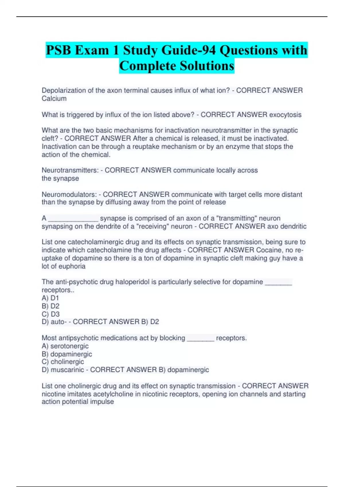 PSB Exam 1 Study Guide-94 Questions with Complete Solutions Depolarization of the axon terminal causes influx of what ion? - CORRECT ANSWER Calcium What is triggered by influx of the ion listed above? - CORRECT ANSWER exocytosis What are the two basic mechanisms for inactivation neurotransmitter in the synaptic cleft? - CORRECT ANSWER After a chemical is released, it must be inactivated. Inactivation can be through a reuptake mechanism or by an enzyme that stops the action of the chemical. Neurotransmitters: - CORRECT ANSWER communicate locally across the synapse Neuromodulators: - CORRECT ANSWER communicate with target cells more distant than the synapse by diffusing away from the point of release A _____________ synapse is comprised of an axon of a "transmitting" neuron synapsing on the dendrite of a "receiving" neuron - CORRECT ANSWER axo dendritic List one catecholaminergic drug and its effects on synaptic transmission, being sure to indicate which catecholamine the drug affects - CORRECT ANSWER Cocaine, no reuptake of dopamine so there is a ton of dopamine in synaptic cleft making guy have a lot of euphoria The anti-psychotic drug haloperidol is particularly selective for dopamine _______ receptors.. A) D1 B) D2 C) D3 D) auto- - CORRECT ANSWER B) D2 Most antipsychotic medications act by blocking _______ receptors. A) serotonergic B) dopaminergic C) cholinergic D) muscarinic - CORRECT ANSWER B) dopaminergic List one cholinergic drug and its effect on synaptic transmission - CORRECT ANSWER nicotine imitates acetylcholine in nicotinic receptors, opening ion channels and starting action potential impulse List one seretonic drug and its effects on synaptic transmission - CORRECT ANSWER Proxil, Zoloft, etc... Ecstasy, reversed re-uptake! Increases serotonin release and blocks reuptake. Afterwards, Less serotonin is available for release and previous autoreceptor. make person less sad/gloomy/depressed Define G-protein linked receptor - CORRECT ANSWER A receptor that is linked to a G protein to activate another protein far away Acetylcholine (ACh) - CORRECT ANSWER Main neurotransmitter for muscle control. -2 receptor types: Nicotinic: a CNS stimulant and active ingredient in tobacco Muscarninic: a poisenous substance found in some mushrooms. BOTH are ionotropic and metotropic and are both found in PNS and CNS Define nicotinic receptor - CORRECT ANSWER a cholinergic receptor that once binded with acetylcholine opens an ion channel