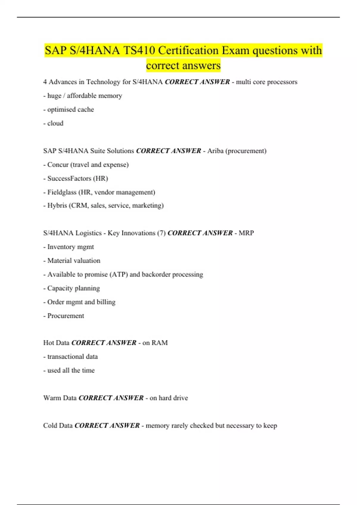 SAP S/4HANA TS410 Certification Exam questions with correct answers