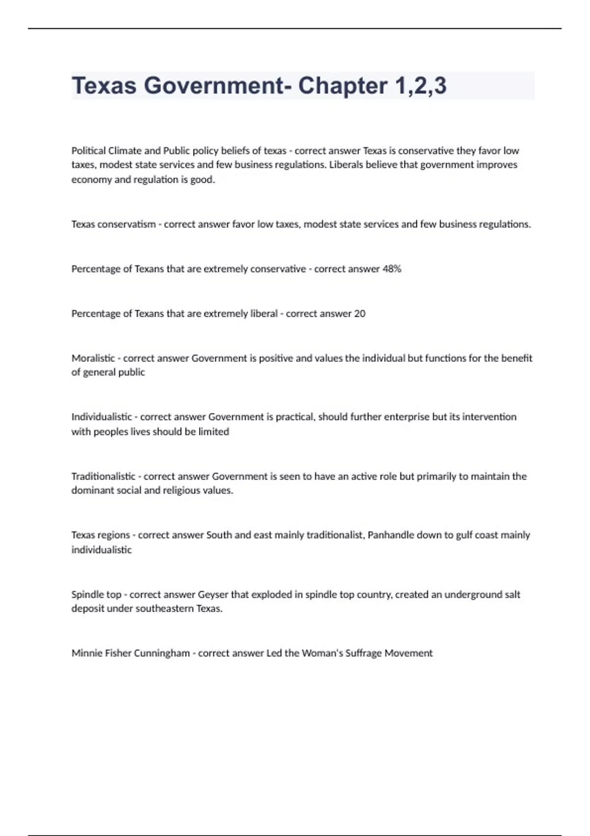 Texas Government- Chapter 1,2,3. fully solved 2023