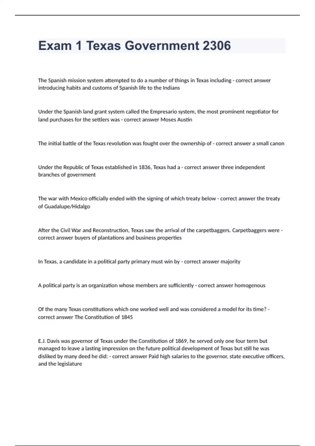 Exam 1 Texas Government 2306 question with correctly answered rated A+ 2023