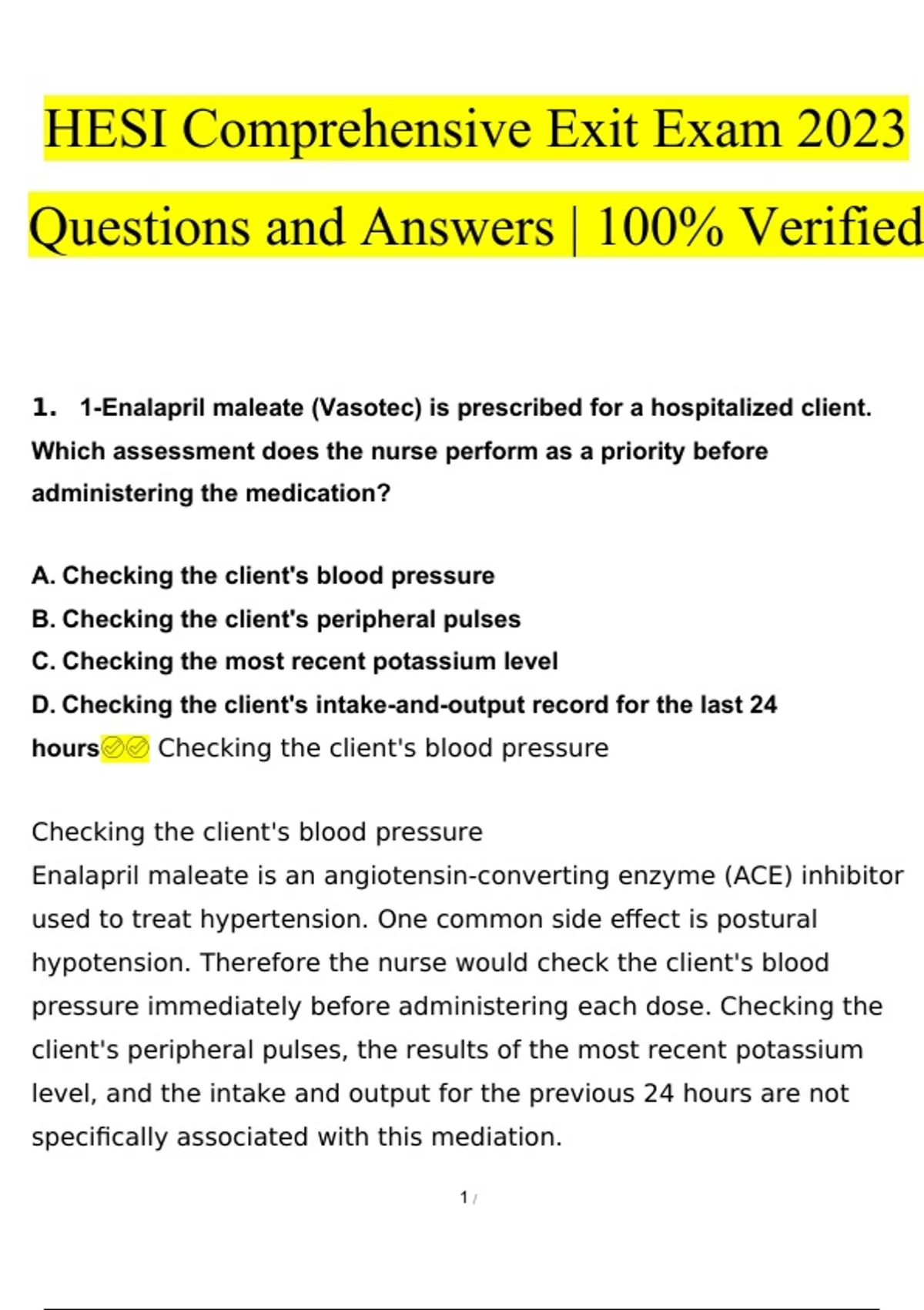 HESI Comprehensive Exit Exam Questions and Answers Latest [100% correct answers]