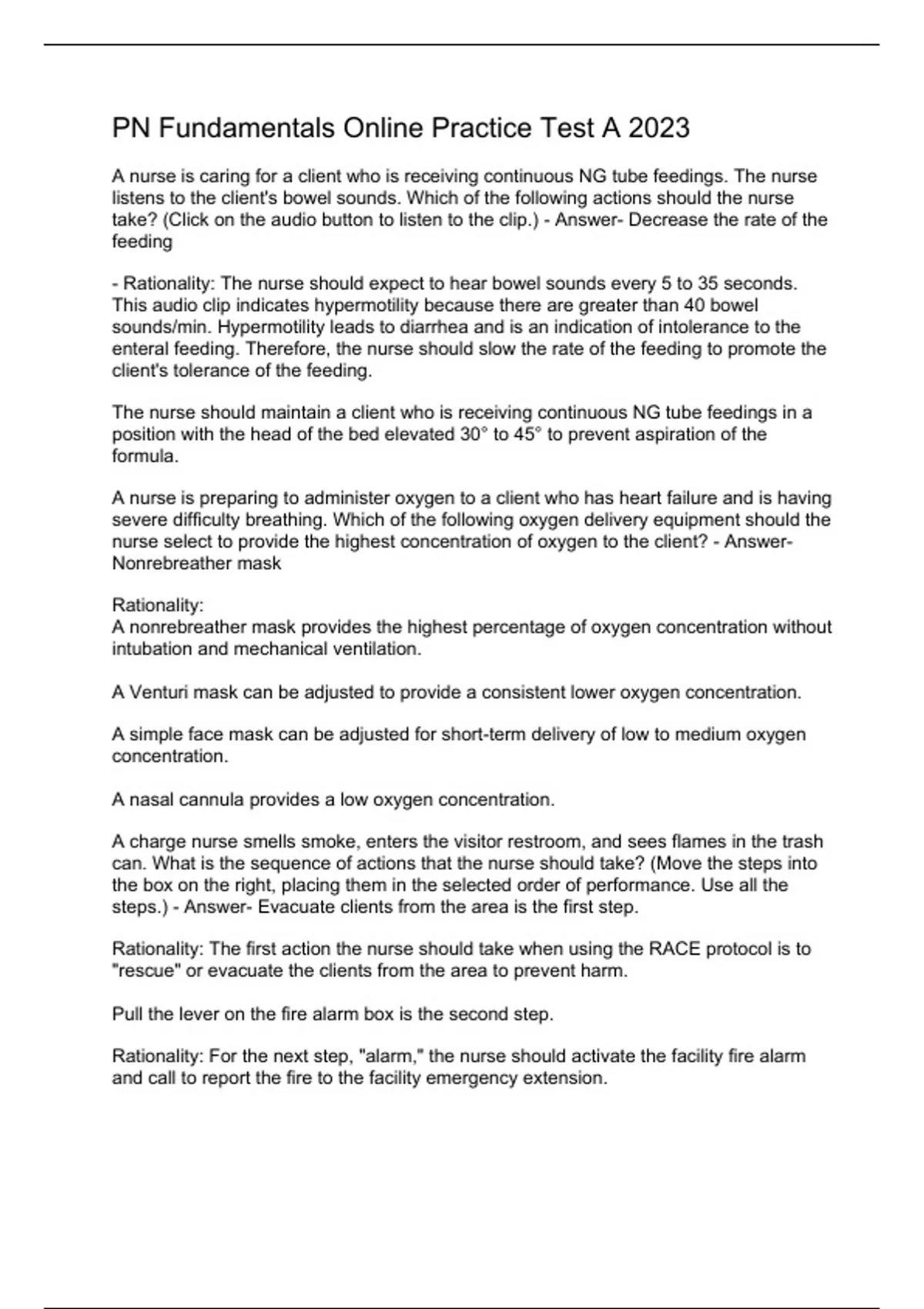 A nurse is caring for a client who is receiving continuous NG tube feedings. The nurse listens to the client's bowel sounds. Which of the following actions should the nurse take? (Click on the audio button to listen to the clip.) - Answer- Decrease the rate of the feeding - Rationality: The nurse should expect to hear bowel sounds every 5 to 35 seconds. This audio clip indicates hypermotility because there are greater than 40 bowel sounds/min. Hypermotility leads to diarrhea and is an indication of intolerance to the enteral feeding. Therefore, the nurse should slow the rate of the feeding to promote the client's tolerance of the feeding. The nurse should maintain a client who is receiving continuous NG tube feedings in a position with the head of the bed elevated 30° to 45° to prevent aspiration of the formula. A nurse is preparing to administer oxygen to a client who has heart failure and is having severe difficulty breathing. Which of the following oxygen delivery equipment should the nurse select to provide the highest concentration of oxygen to the client? - Answer- Nonrebreather mask Rationality: A nonrebreather mask provides the highest percentage of oxygen concentration without intubation and mechanical ventilation. A Venturi mask can be adjusted to provide a consistent lower oxygen concentration. A simple face mask can be adjusted for short-term delivery of low to medium oxygen concentration. A nasal cannula provides a low oxygen concentration. A charge nurse smells smoke, enters the visitor restroom, and sees flames in the trash can. What is the sequence of actions that the nurse should take? (Move the steps into the box on the right, placing them in the selected order of performance. Use all the steps.) - Answer- Evacuate clients from the area is the first step. Rationality: The first action the nurse should take when using the RACE protocol is to "rescue" or evacuate the clients from the area to prevent harm. Pull the lever on the fire alarm box is the second step. Rationality: For the next step, "alarm," the nurse should activate the facility fire alarm and call to report the fire to the facility emergency extension.