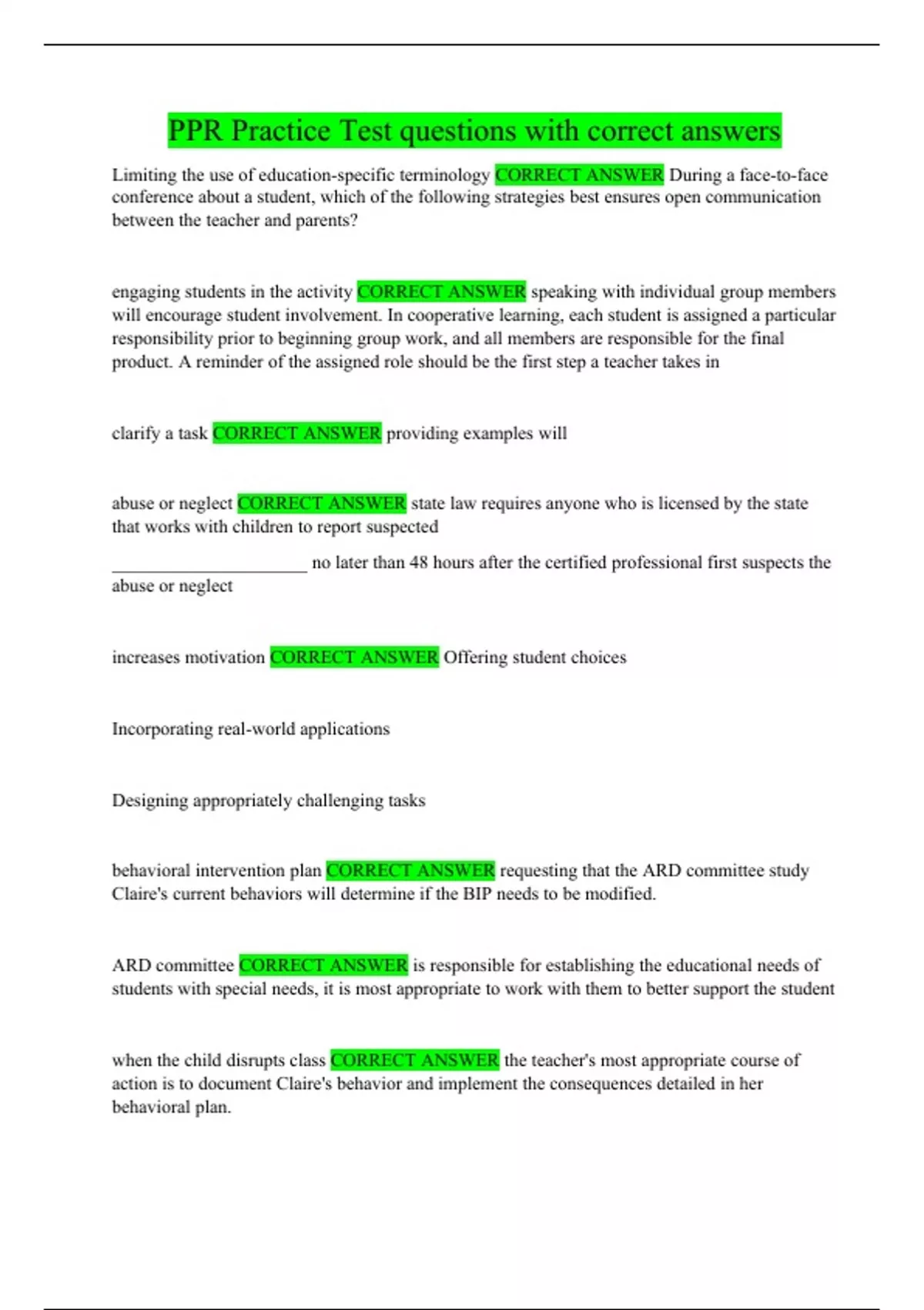 PPR Practice Test questions with correct answers