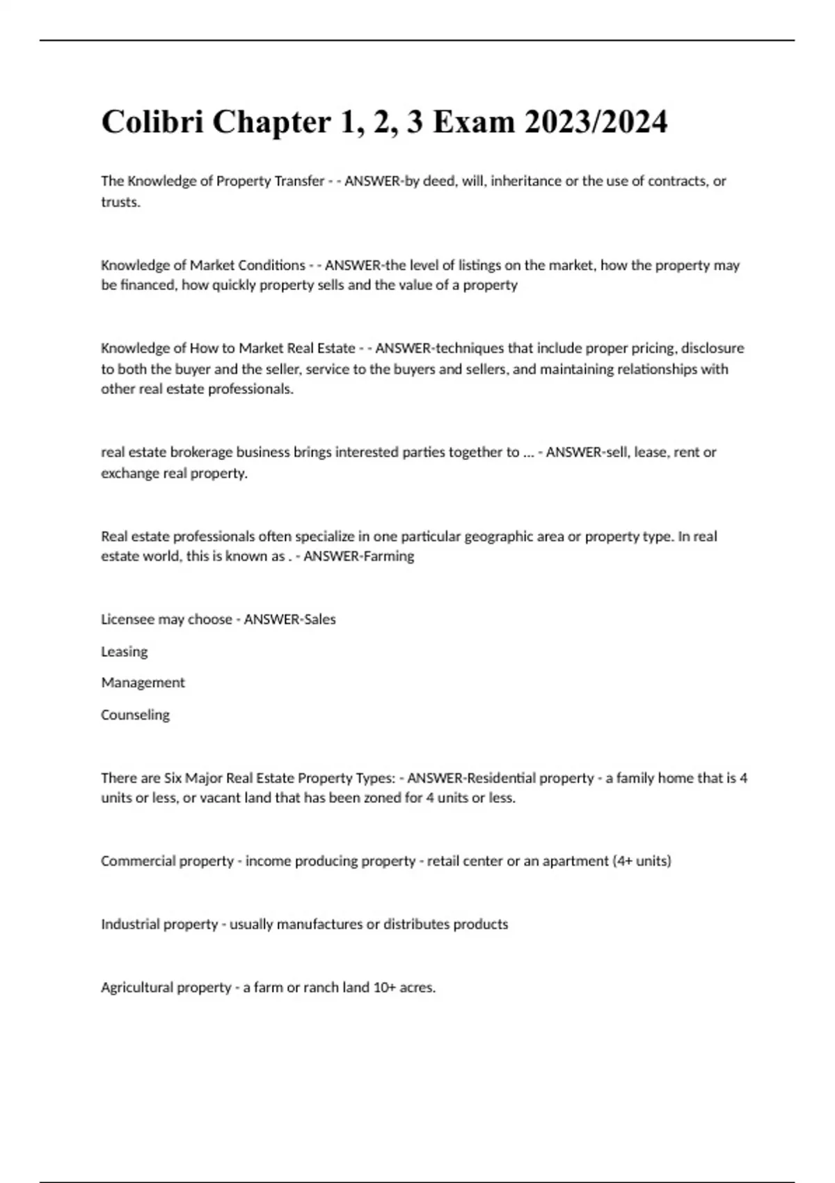 Colibri Chapter 1, 2, 3 Exam 2023/2024 The Knowledge of Property Transfer - - ANSWER-by deed, will, inheritance or the use of contracts, or trusts. Knowledge of Market Conditions - - ANSWER-the level of listings on the market, how the property may be financed, how quickly property sells and the value of a property Knowledge of How to Market Real Estate - - ANSWER-techniques that include proper pricing, disclosure to both the buyer and the seller, service to the buyers and sellers, and maintaining relationships with other real estate professionals. real estate brokerage business brings interested parties together to ... - ANSWER-sell, lease, rent or exchange real property. Real estate professionals often specialize in one particular geographic area or property type. In real estate world, this is known as . - ANSWER-Farming Licensee may choose - ANSWER-Sales Leasing Management Counseling There are Six Major Real Estate Property Types: - ANSWER-Residential property - a family home that is 4 units or less, or vacant land that has been zoned for 4 units or less. Commercial property - income producing property - retail center or an apartment (4+ units) Industrial property - usually manufactures or distributes products Agricultural property - a farm or ranch land 10+ acres.