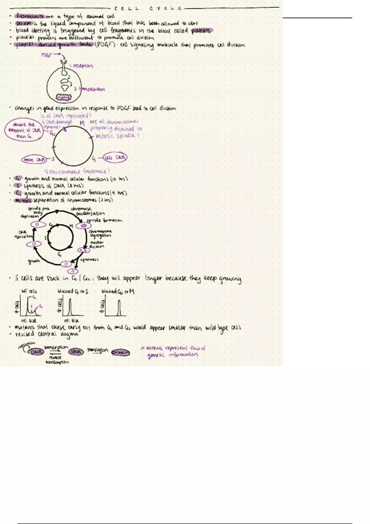 Lecture notes covering the process of mitosis, DNA replication, gene expression, PCR, and cancer.