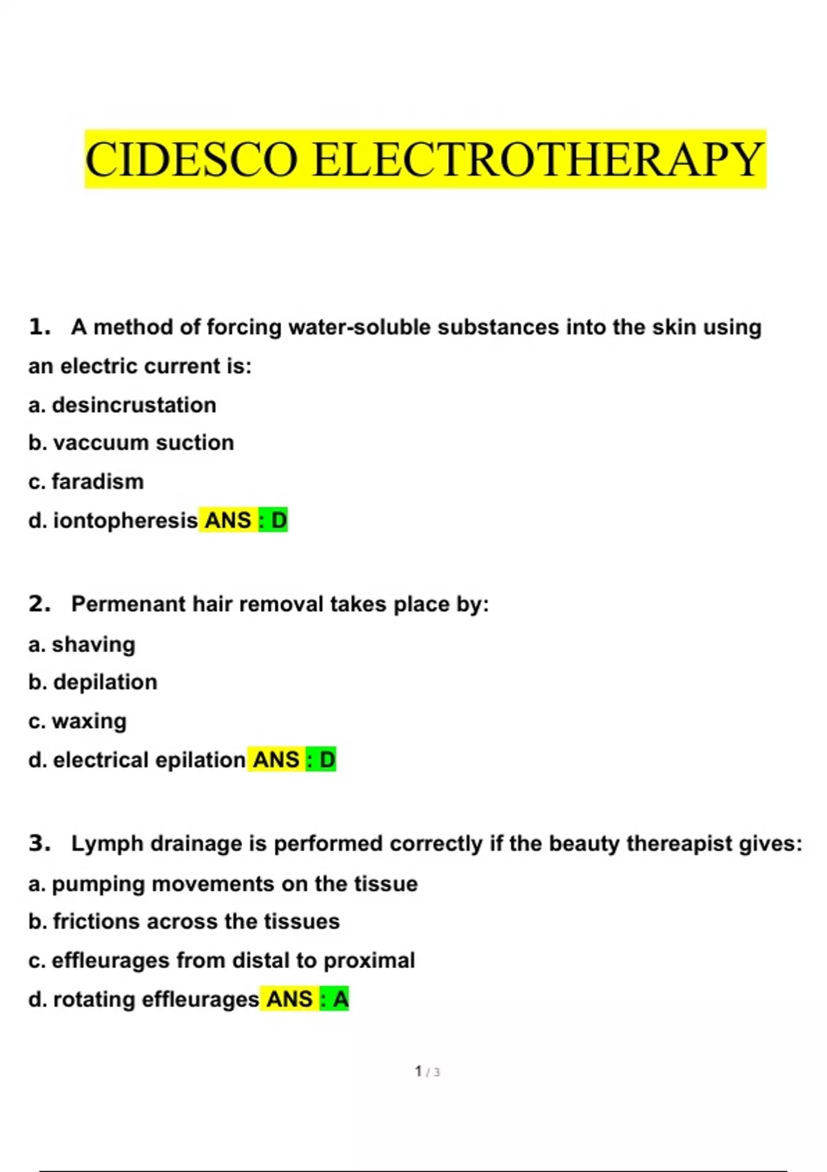 CIDESCO ELECTROTHERAPY 1.A method of forcing water-soluble substances into the skin using an electric current is: