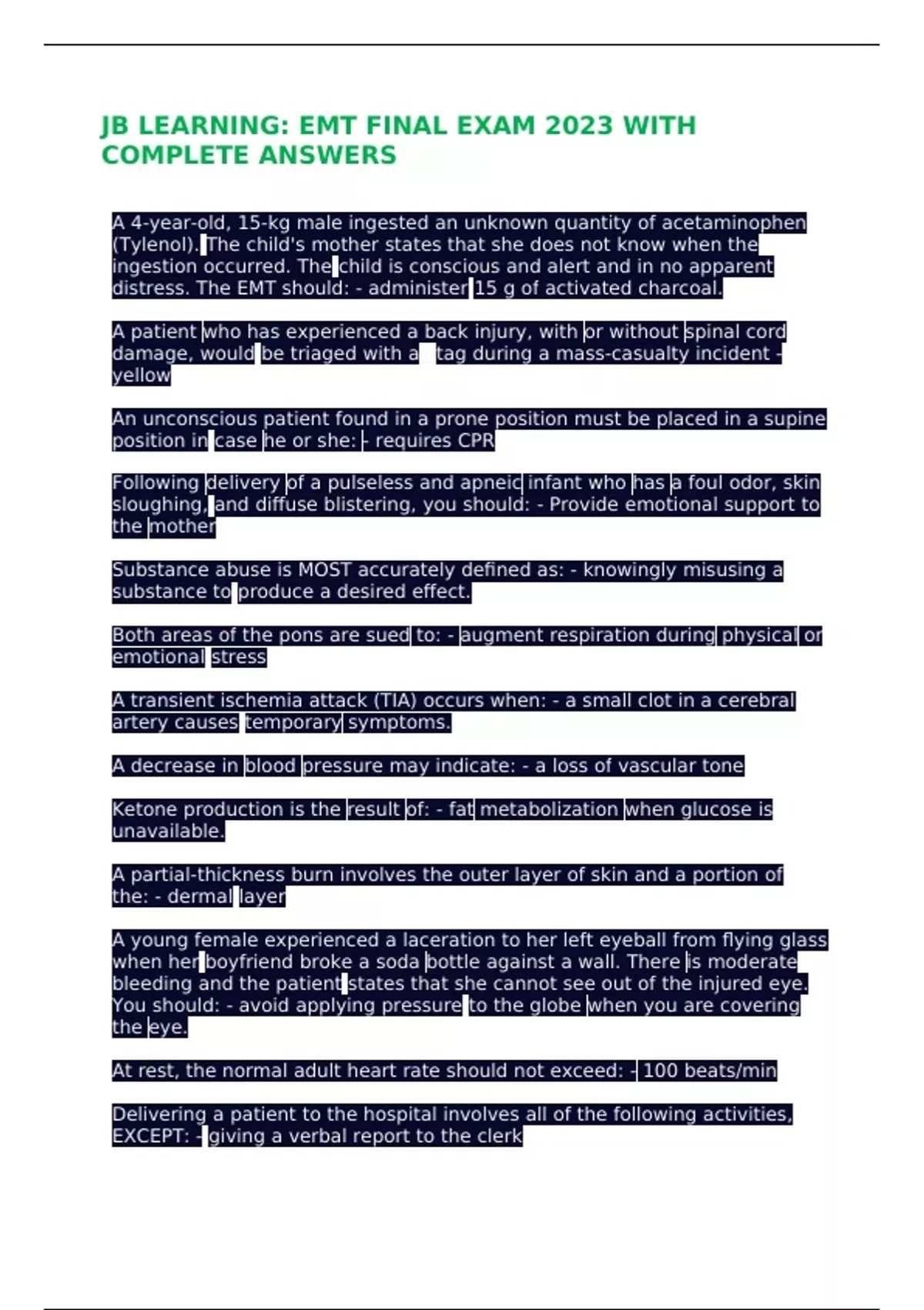 JB LEARNING: EMT FINAL EXAM 2023 WITH COMPLETE ANSWERS