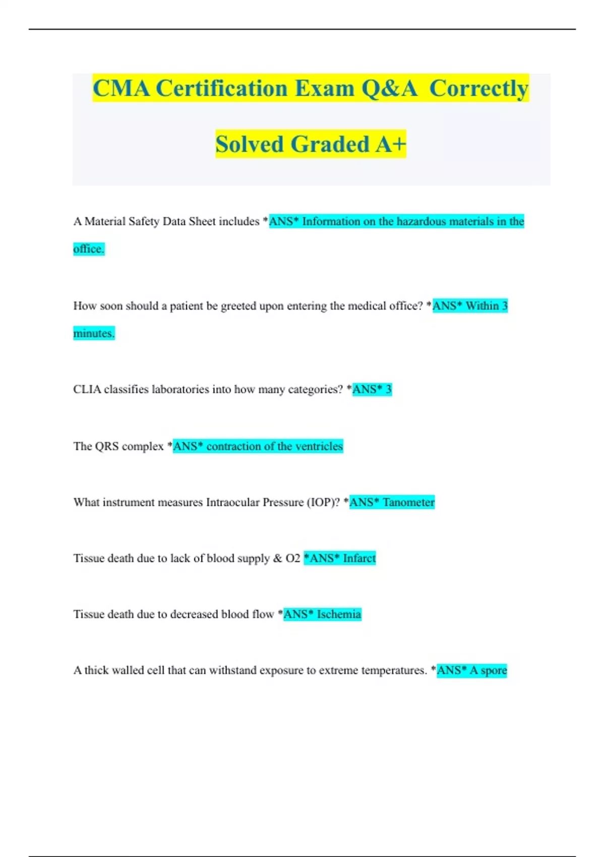 CMA Certification Exam Q&A Correctly Solved Graded A+ A Material Safety Data Sheet includes *ANS* Information on the hazardous materials in the office. How soon should a patient be greeted upon entering the medical office? *ANS* Within 3 minutes. CLIA classifies laboratories into how many categories? *ANS* 3 The QRS complex *ANS* contraction of the ventricles What instrument measures Intraocular Pressure (IOP)? *ANS* Tanometer Tissue death due to lack of blood supply & O2 *ANS* Infarct Tissue death due to decreased blood flow *ANS* Ischemia A thick walled cell that can withstand exposure to extreme temperatures. *ANS* A spore First line of defense against micro-organisms *ANS* intact skin Normal urine color *ANS* Straw A urine pH of 7.2 or higher means *ANS* high protein diet, fever, increased intake of vitamin C, diarrhea How long should urine be centrifuged? *ANS* 5 minutes Cells that make up the greatest amount of solid blood components. *ANS* erythrocytes What color tube would be used for a PT/PTT *ANS* light blue What condition would NOT be associated with a low Hct? *ANS* Polycythemia How far ahead should an appointment book be "blocked out?" *ANS* 6 months Which is responsible for handling all instructions & calculations received from other hardware components in a computer as well as software programs running on the computer? *ANS* CPU Computer memory is measured in *ANS* gigabytes A structured collection of records & information stored in a computer system *ANS* database Has an assignment of lifetime benefits *ANS* CHAMPVA Law that covers hiring procedures of new employees *ANS* EEOA A "systems approach" to office management is to *ANS* integrate functions The primary goal of an employee performance evaluation *ANS* Give positive reinforcement for continued improvement. What lead is NOT used in EKG recording? *ANS* RL (it is a ground and not a lead) The goal of the 1996 AAMA Role Delineation Study *ANS* To revise and update standards used for medical assisting and program accreditation. A physician does NOT have to report these to the proper authorities. *ANS* Strokes The easiest way to spot an error when proof-reading. *ANS* Read from bottom to top. A compliance plan does NOT demonstrate that the medical office *ANS* is attempting to lower health insurance rates. Who has the greatest responsibility for accurate documentation and completion of insurance forms? *ANS* The physician What should be reviewed by the Quality Assurance Committee *ANS* Disallowed insurance claims, waiting times for patients, emergency procedures, data trends of events and claims. What type of violation would OSHA cite an employee for? *ANS* Failing to remove PPE before leaving the office. How long foes OSHA require hepatitis vaccine records to be kept? *ANS* 30 years What is the optimal temperature for an exam room? *ANS* 75 degrees What is a unit of measurement used for occupational radiation exposure? *ANS* rem What distance should a heat lamp be placed from a patient's skin? *ANS* 2-4 feet What kind of check is a payer's check guaranteed by the bank? *ANS* certified check What angle is a subQ injection given? *ANS* 45 degrees Albumin in urine could indicate what? *ANS* hypertension, heart failure, renal disease, diabetes At what age should blood pressure be included in vital signs? *ANS* Age 5 What location should be used to obtain a pulse on an infant? *ANS* Apex of heart What section of the PDR is the index for manufacturers located? *ANS* White section What is NOT a classification of medical waste? *ANS* tissue What is the first step to process mail efficiently? *ANS* Sort mail in clean work space. Fastest type of mail *ANS* Express mail A sentinel event is *ANS* an unexpected occurrence involving death or serious injury An audit trail is *ANS* a tracking device What organization is responsible for safety guidelines in handling hazardous & contaminated materials? *ANS* OSHA An appointment where the patient does not show up is called *ANS* a failed appointment