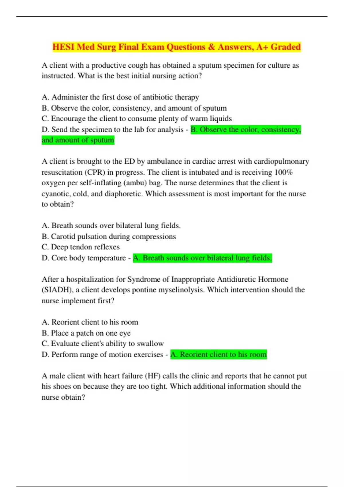 HESI Med Surg Final Exam 2023 Questions & Answers, A+ Graded-A client with a productive cough has obtained a sputum specimen for culture as instructed. What is the best initial nursing action? A. Administer the first dose of antibiotic therapy B. Observe the color, consistency, and amount of sputum C. Encourage the client to consume plenty of warm liquids D. Send the specimen to the lab for analysis - B. Observe the color, consistency, and amount of sputum A client is brought to the ED by ambulance in cardiac arrest with cardiopulmonary resuscitation (CPR) in progress. The client is intubated and is receiving 100% oxygen per self-inflating (ambu) bag. The nurse determines that the client is cyanotic, cold, and diaphoretic. Which assessment is most important for the nurse to obtain? A. Breath sounds over bilateral lung fields. B. Carotid pulsation during compressions C. Deep tendon reflexes D. Core body temperature - A. Breath sounds over bilateral lung fields. After a hospitalization for Syndrome of Inappropriate Antidiuretic Hormone (SIADH), a client develops pontine myselinolysis. Which intervention should the nurse implement first? A. Reorient client to his room B. Place a patch on one eye C. Evaluate client's ability to swallow D. Perform range of motion exercises - A. Reorient client to his room A male client with heart failure (HF) calls the clinic and reports that he cannot put his shoes on because they are too tight. Which additional information should the nurse obtain? A. What time did he take his last medications? B. Has his weight changed in the last several days? C. Is he still able to tighten his belt buckle? D. How many hours did he sleep last night? - B. Has his weight changed in the last several days? An older adult woman with a long history of chronic obstructive pulmonary disease (COPD) is admitted with progressive shortness of breath and a persistent cough. She is anxious and is complaining of a dry mouth. Which intervention should the nurse implement? A. Administer a prescribed sedative B. Encourage client to drink water C. Apply a high-flow venturi mask D. Assist her to an upright position - D. Assist her to an upright position A client with a history of asthma and bronchitis arrives at the clinic with shortness of breath, productive cough with thickened tenacious mucous, and the inability to walk up a flight of stairs without experiencing breathlessness. Which action is most important for the nurse to instruct the client about self-care? A. Increase the daily intake of oral fluids to liquefy secretions B. Avoid crowded enclosed areas to reduce pathogen exposure C. Call the clinic if undesirable side effects of mediations occur D. Teach anxiety reduction methods for feelings of suffocation - A. Increase the daily intake of oral fluids to liquefy secretions A cardiac catherterization of a client with heart disease indicates the following blockages: 95% proximal left anterior descending (LAD), 99% proximal circumflex, and ? % proximal right coronary artery (RCA). The client later asks the nurse "what does all this mean for me?" What information should the nurse provide?