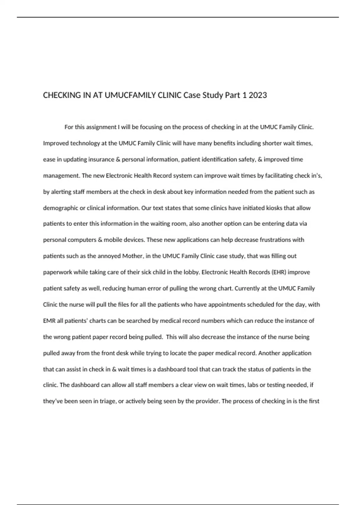 Summary CHECKING IN AT UMUCFAMILY CLINIC Case Study Part 1 2023