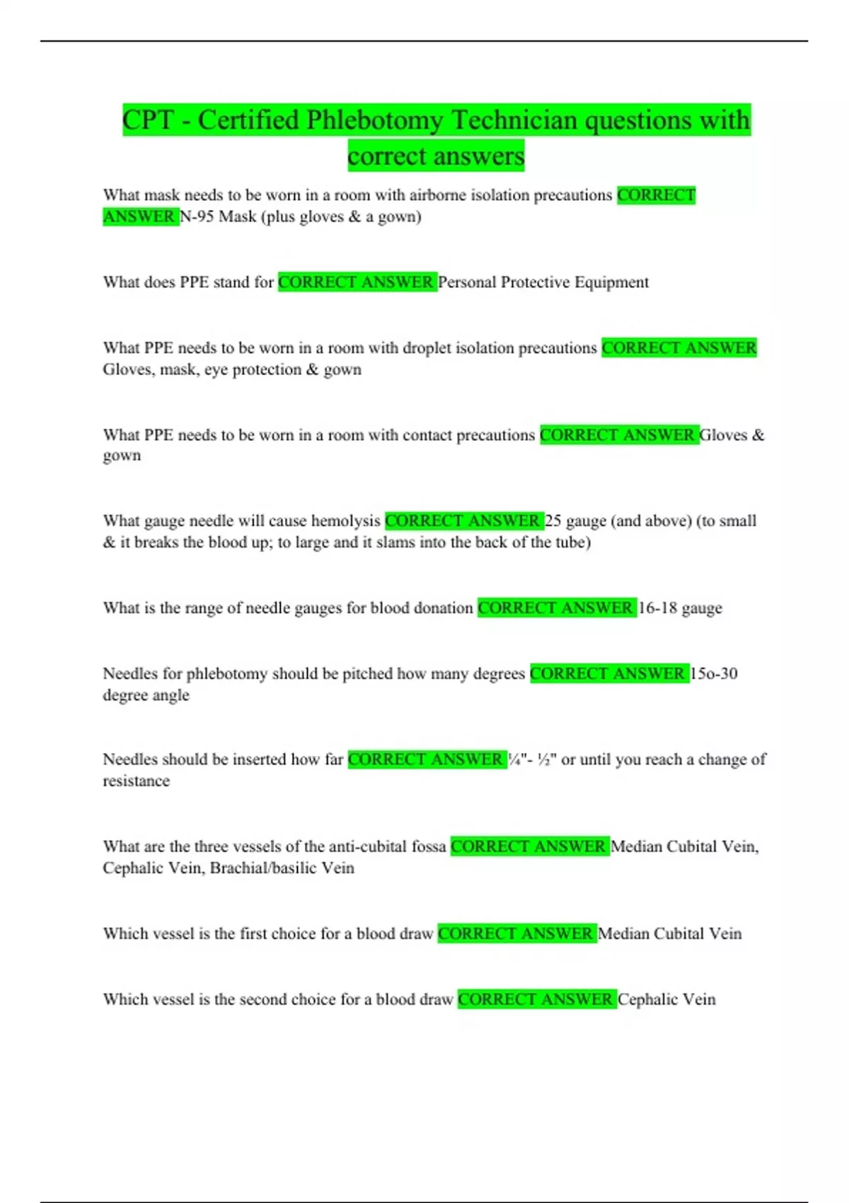 CPT - Certified Phlebotomy Technician questions with correct answers