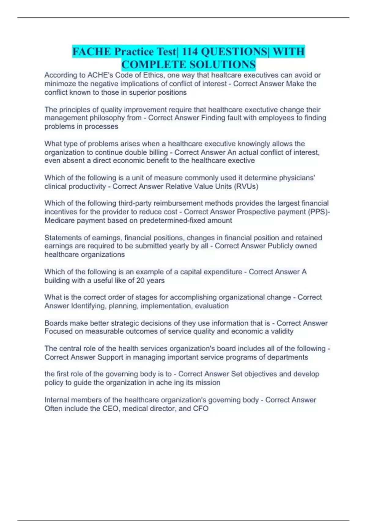 FACHE Practice Test| 114 QUESTIONS| WITH COMPLETE SOLUTIONS