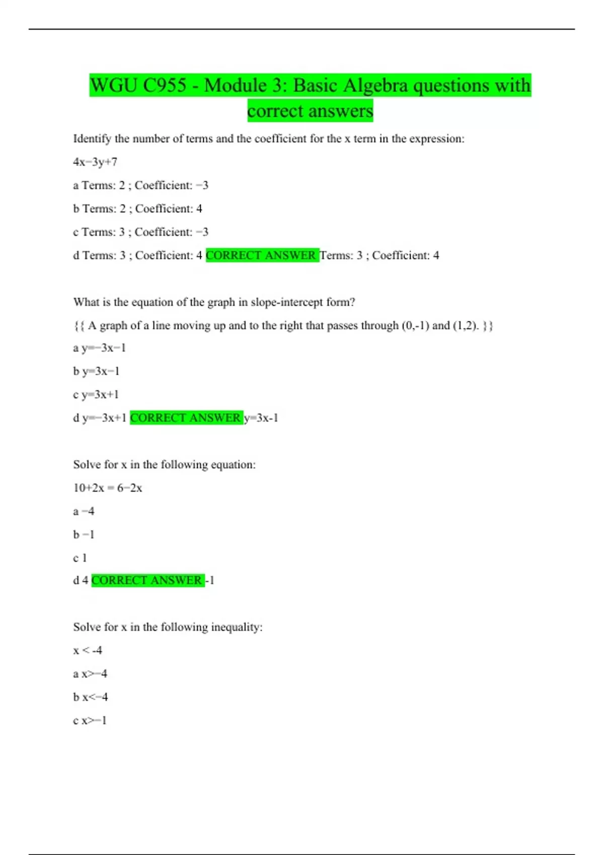wgu c955 module 3 basic algebra questions with