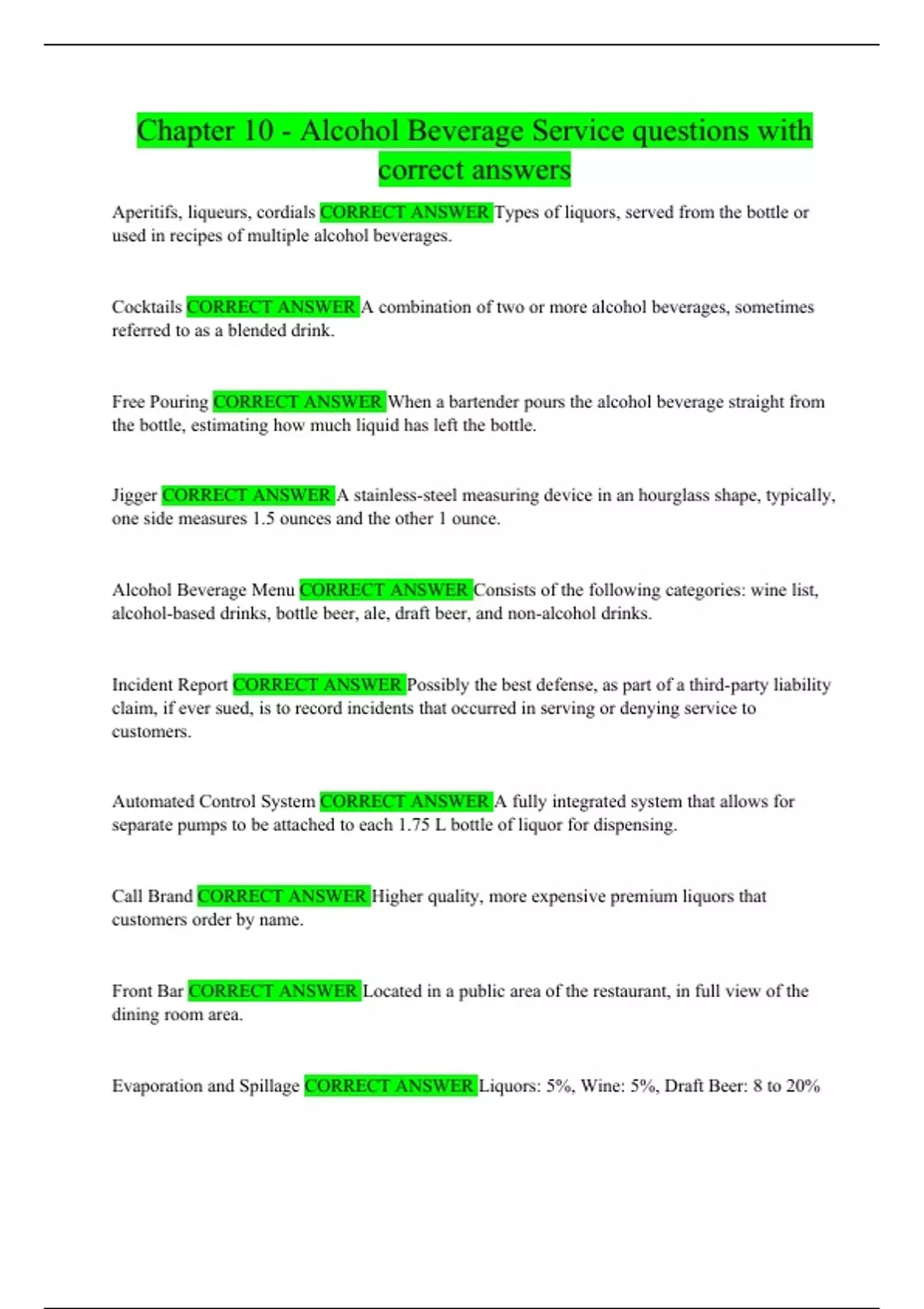 Chapter 10 - Alcohol Beverage Service questions with correct answers