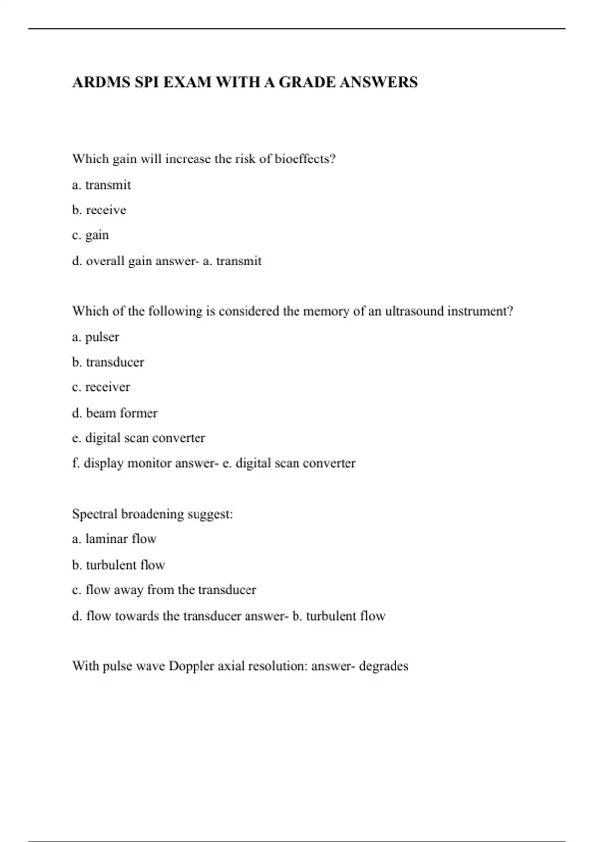 Which gain will increase the risk of bioeffects? a. transmit b. receive c. gain d. overall gain answer- a. transmit Which of the following is considered the memory of an ultrasound instrument? a. pulser b. transducer c. receiver d. beam former e. digital scan converter f. display monitor answer- e. digital scan converter Spectral broadening suggest: a. laminar flow b. turbulent flow c. flow away from the transducer d. flow towards the transducer answer- b. turbulent flow With pulse wave Doppler axial resolution: answer- degrades
