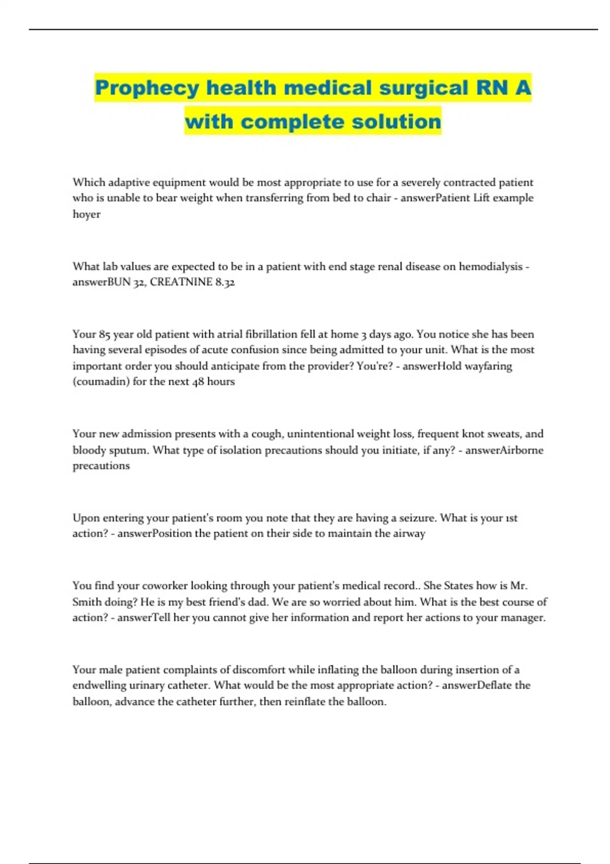 Prophecy health medical surgical RN A with complete solution Which adaptive equipment would be most appropriate to use for a severely contracted patient who is unable to bear weight when transferring from bed to chair - answerPatient Lift example hoyer What lab values are expected to be in a patient with end stage renal disease on hemodialysis - answerBUN 32, CREATNINE 8.32 Your 85 year old patient with atrial fibrillation fell at home 3 days ago. You notice she has been having several episodes of acute confusion since being admitted to your unit. What is the most important order you should anticipate from the provider? You're? - answerHold wayfaring (coumadin) for the next 48 hours Your new admission presents with a cough, unintentional weight loss, frequent knot sweats, and bloody sputum. What type of isolation precautions should you initiate, if any? - answerAirborne precautions Upon entering your patient's room you note that they are having a seizure. What is your 1st action? - answerPosition the patient on their side to maintain the airway You find your coworker looking through your patient's medical record.. She States how is Mr. Smith doing? He is my best friend's dad. We are so worried about him. What is the best course of action? - answerTell her you cannot give her information and report her actions to your manager. Your male patient complaints of discomfort while inflating the balloon during insertion of a endwelling urinary catheter. What would be the most appropriate action? - answerDeflate the balloon, advance the catheter further, then reinflate the balloon. Your patient takes regular insulin and NPH twice A-day for glucose control. What times should the patient be taught to be alert for signs of hypoglycemia? - answerIs late afternoon and early morning What is a proton pump inhibitor, such as pantoprazole (protonix) used for? - answerReduce gastric acid secretion Your patient has a non productive cough and presence of secretions in his tracheostomy. Prior to sectioning the patient, what should you do 1st? - answerHyperoxygenate patient dietary teaching for a patient with chronic renal failure should include choices that are: - answerLow potassium, low protein, moderate fat Which of the following nursing diagnosis is most important for a patient with chronic obstructive pulmonary disease(COPD) - answerImpaired gas exchange Your patient is admitted from the ED with failure to thrive and advanced dementia. You note he is extremely underweight, appears unbathed for some time, and has a stage 4 pressure injury to his coccyx. You were told in report that he lives at home with family members. What should you do? - answerNotify the charge nurse and social worker of your concerns. You have a patient going for dialysis. There are medications include Lisinopril(prinivil), ondansetron (zofran), famotidine(pepcid) and atorvastatin(lipitor). Which medication would you possibly hold and seek clarification? - answerLISINOPRIL(PRINIVIL) What is the best indication of an acute neurological problem? - answerChange in level of consciousness Your patient is admitted with diverticulitis. What type of diet do you expect to be ordered for the patient? - answerClear liquids Which tool should you use to assess pain in your 80 year old patient with severe dementia? - answer? Your post op patient has a Jackson - Pratt drain in place. how do you ensure effective drain function? - answerCompress the drain, then plug the bulb to establish suction. Is a patient with peritonitis Presents with tachycardia, hypotension , and dehydration. What other assessment finding would you anticipate as part of your physical assessment? - answerSevere abdominal pain or rebound tenderness Your patient with a known history of diabetes is displaying symptoms of diaphoresis, Cool skin, lethargy, And shakiness. What is your 1st action? - answerCheck the patient's blood glucose level a patient on warfarin(Coumadin/jantoven) has an INR of 6. Which medication would you anticipate administering? - answerVitamin K While in a supine position your patient States" I'm tired and cannot catch my breath". Physical assessment reveals juggler vein distention and a 3rd heart sound(S3). These symptoms are indicative of what condition? - answerHeart failure Upon entry to your patient's room, you find her sitting in high Fowler's Position and complaining of shortness of breath. Her respiratory rate is 34 breaths/minute And 02 sat is 84%. Which mode of oxygen delivery would most likely reverse the symptoms? - answerNon rebreather mask Your patient continues to pull at their iv located in their left forearm despite verbal reminders And increased observation. The nursing assistant recommends using soft mitt Restraints on the patient. What is your recommendation? - answerRequest and order for soft mitts As they are the least restrictive.. What is an early symptom that a patient is developing a complication of heart failure? - answerEdema in the legs and feet You were hired to work the medical unit and when you arrive at work the charge nurse has assigned you to the post surgical unit since they are under staffed. Which is the most appropriate action? - answerReport to the post surgical unit What type of personal protective equipment(Ppe) Is applied prior to entering a room for a patient with with C diff? - answerGown and gloves When would sucralfate(Carafate) 4 times daily be scheduled for? - answer1 hour before meals and at bedtime Your new patient was admitted with Blunt force trauma to the abdomen Following a motor vehicle accident. A NG Tube is in place for decompression, however, you note during the assessment that the stomach is rigid and hard during palpation. What condition do you suspect. - answerHemorrhage What is clubbing of the fingers most likely associated with? - answerChronic oxygen deficiency Is your patient with hepatitis C Exhibits signs of jaundice and a distended abdomen. What procedure would you anticipate being performed 