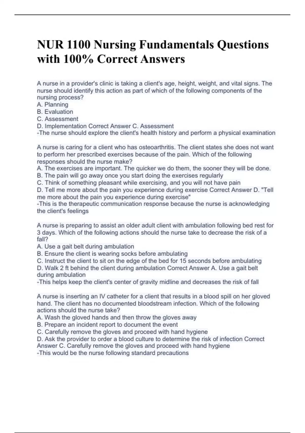 A nurse in a provider's clinic is taking a client's age, height, weight, and vital signs. The nurse should identify this action as part of which of the following components of the nursing process? A. Planning B. Evaluation C. Assessment D. Implementation Correct Answer C. Assessment -The nurse should explore the client's health history and perform a physical examination A nurse is caring for a client who has osteoarthritis. The client states she does not want to perform her prescribed exercises because of the pain. Which of the following responses should the nurse make? A. The exercises are important. The quicker we do them, the sooner they will be done. B. The pain will go away once you start doing the exercises regularly C. Think of something pleasant while exercising, and you will not have pain D. Tell me more about the pain you experience during exercise Correct Answer D. "Tell me more about the pain you experience during exercise" -This is the therapeutic communication response because the nurse is acknowledging the client's feelings A nurse is preparing to assist an older adult client with ambulation following bed rest for 3 days. Which of the following actions should the nurse take to decrease the risk of a fall? A. Use a gait belt during ambulation B. Ensure the client is wearing socks before ambulating C. Instruct the client to sit on the edge of the bed for 15 seconds before ambulating D. Walk 2 ft behind the client during ambulation Correct Answer A. Use a gait belt during ambulation -This helps keep the client's center of gravity midline and decreases the risk of fall A nurse is inserting an IV catheter for a client that results in a blood spill on her gloved hand. The client has no documented bloodstream infection. Which of the following actions should the nurse take? A. Wash the gloved hands and then throw the gloves away B. Prepare an incident report to document the event C. Carefully remove the gloves and proceed with hand hygiene D. Ask the provider to order a blood culture to determine the risk of infection Correct Answer C. Carefully remove the gloves and proceed with hand hygiene -This would be the nurse following standard precautions