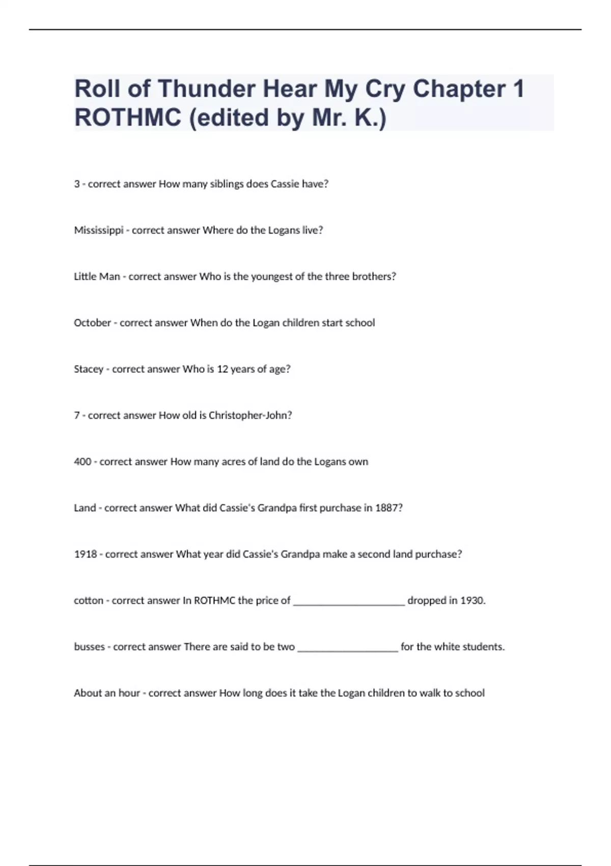Roll of Thunder Hear My Cry Chapter 1 ROTHMC (edited by Mr. K.) well answered 2023