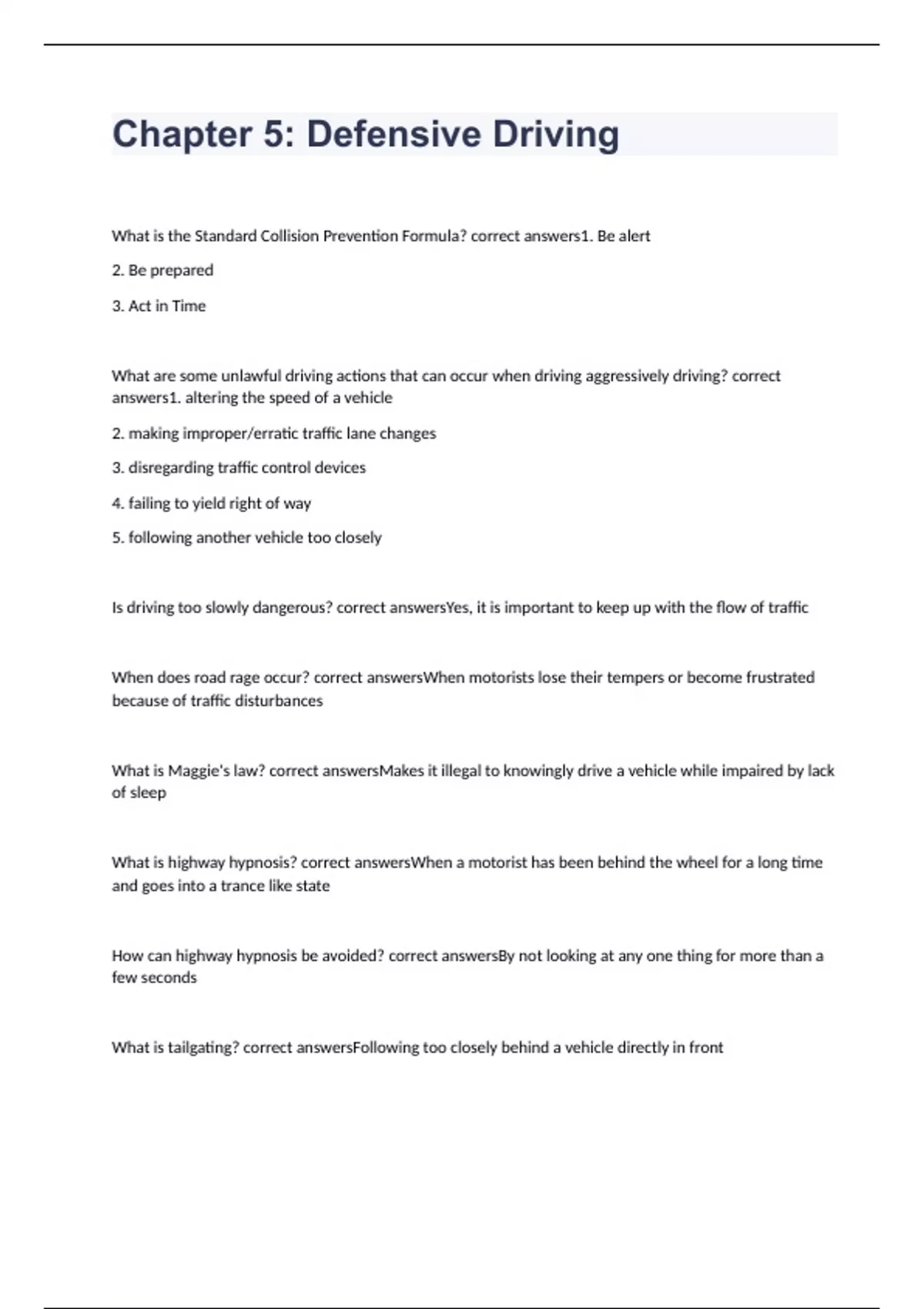 What is the Standard Collision Prevention Formula? correct answers1. Be alert 2. Be prepared 3. Act in Time What are some unlawful driving actions that can occur when driving aggressively driving? correct answers1. altering the speed of a vehicle 2. making improper/erratic traffic lane changes 3. disregarding traffic control devices 4. failing to yield right of way 5. following another vehicle too closely Is driving too slowly dangerous? correct answersYes, it is important to keep up with the flow of traffic When does road rage occur? correct answersWhen motorists lose their tempers or become frustrated because of traffic disturbances What is Maggie's law? correct answersMakes it illegal to knowingly drive a vehicle while impaired by lack of sleep What is highway hypnosis? correct answersWhen a motorist has been behind the wheel for a long time and goes into a trance like state How can highway hypnosis be avoided? correct answersBy not looking at any one thing for more than a few seconds What is tailgating? correct answersFollowing too closely behind a vehicle directly in front