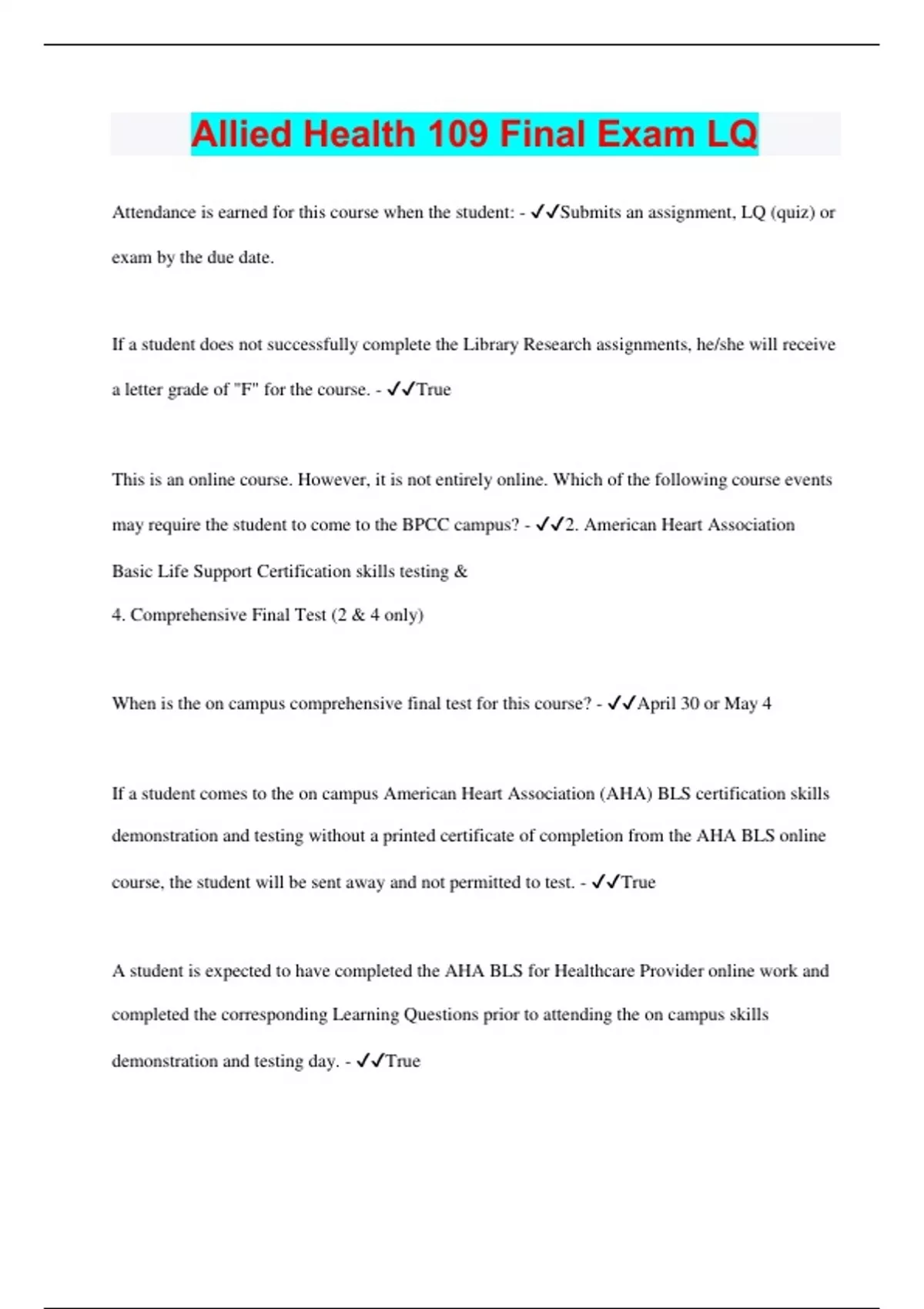 Attendance is earned for this course when the student: - Submits an assignment, LQ (quiz) or exam by the due date. If a student does not successfully complete the Library Research assignments, he/she will receive a letter grade of "F" for the course. - True This is an online course. However, it is not entirely online. Which of the following course events may require the student to come to the BPCC campus? - 2. American Heart Association Basic Life Support Certification skills testing & 4. Comprehensive Final Test (2 & 4 only) When is the on campus comprehensive final test for this course? - April 30 or May 4 If a student comes to the on campus American Heart Association (AHA) BLS certification skills demonstration and testing without a printed certificate of completion from the AHA BLS online course, the student will be sent away and not permitted to test. - True A student is expected to have completed the AHA BLS for Healthcare Provider online work and completed the corresponding Learning Questions prior to attending the on campus skills demonstration and testing day. - True