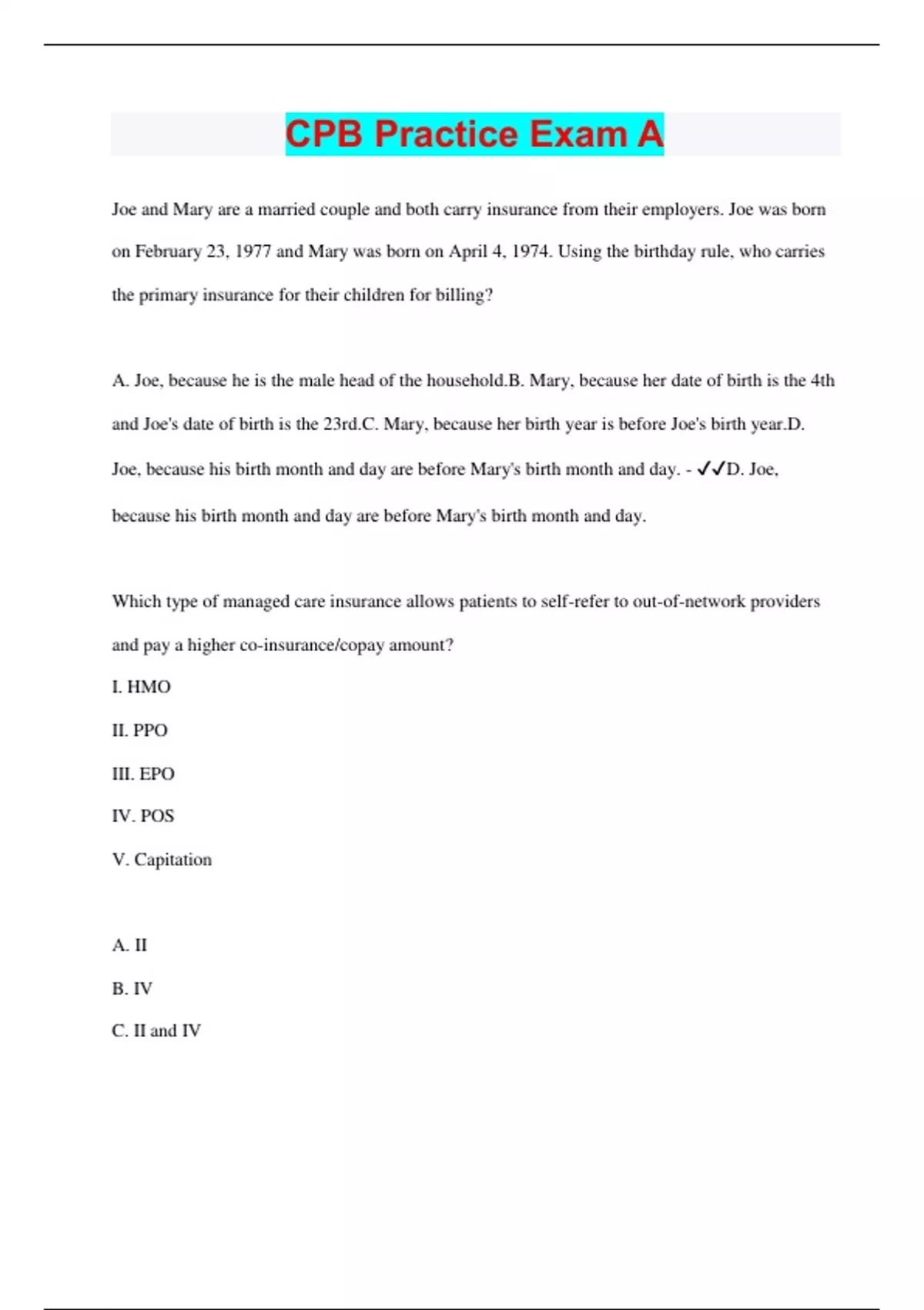 Joe and Mary are a married couple and both carry insurance from their employers. Joe was born on February 23, 1977 and Mary was born on April 4, 1974. Using the birthday rule, who carries the primary insurance for their children for billing? A. Joe, because he is the male head of the household.B. Mary, because her date of birth is the 4th and Joe's date of birth is the 23rd.C. Mary, because her birth year is before Joe's birth year.D. Joe, because his birth month and day are before Mary's birth month and day. - D. Joe, because his birth month and day are before Mary's birth month and day. Which type of managed care insurance allows patients to self-refer to out-of-network providers and pay a higher co-insurance/copay amount? I. HMO II. PPO III. EPO IV. POS V. Capitation A. II B. IV C. II and IV