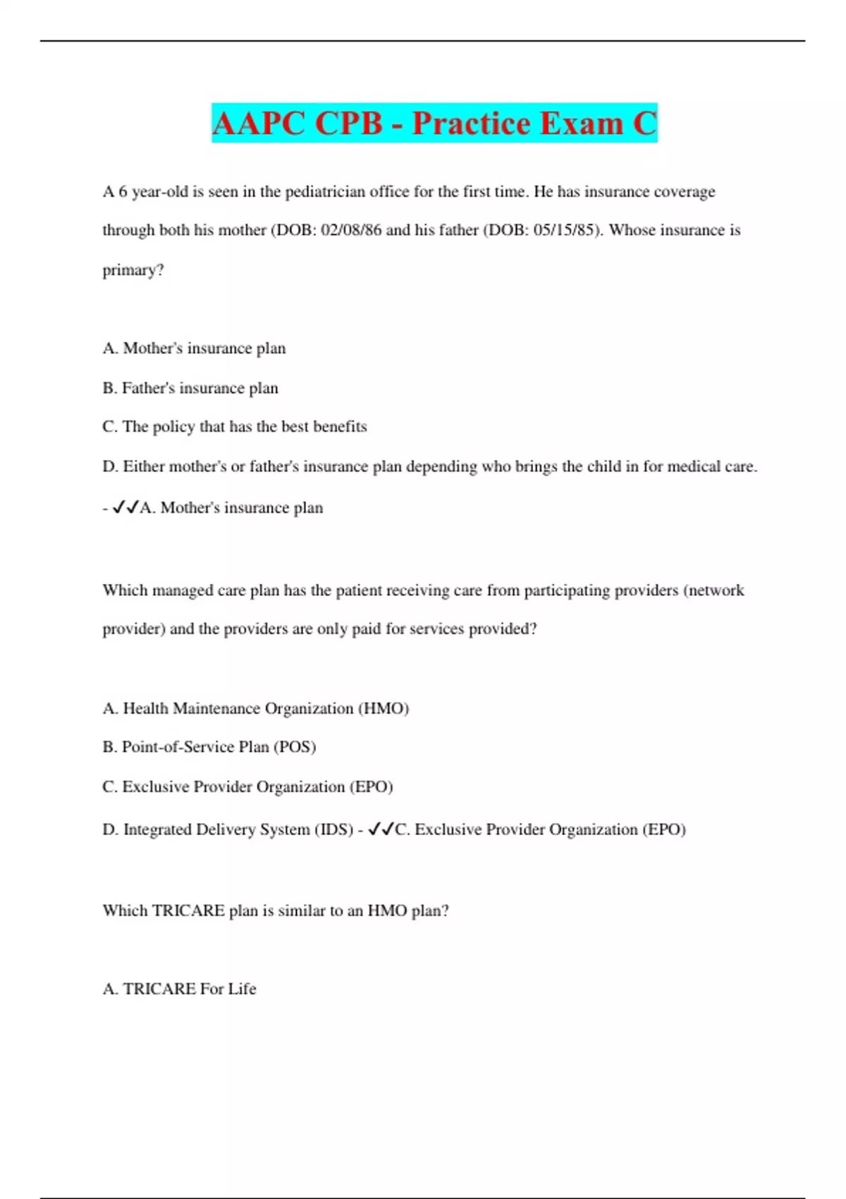 AAPC CPB - Practice Exam C | 2023 | 200 Questions with 100% Correct Answers | Updated & Verified | 20 Pages