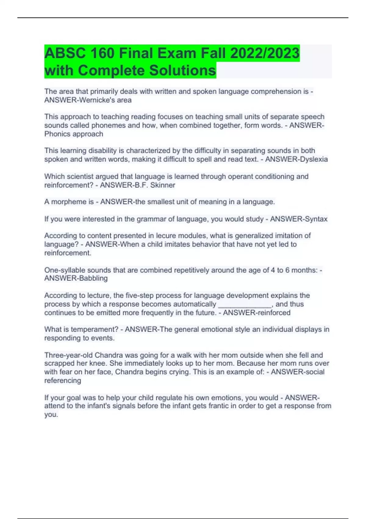 The area that primarily deals with written and spoken language comprehension is - ANSWER-Wernicke's area This approach to teaching reading focuses on teaching small units of separate speech sounds called phonemes and how, when combined together, form words. - ANSWER-Phonics approach This learning disability is characterized by the difficulty in separating sounds in both spoken and written words, making it difficult to spell and read text. - ANSWER-Dyslexia Which scientist argued that language is learned through operant conditioning and reinforcement? - ANSWER-B.F. Skinner A morpheme is - ANSWER-the smallest unit of meaning in a language. If you were interested in the grammar of language, you would study - ANSWER-Syntax According to content presented in lecure modules, what is generalized imitation of language? - ANSWER-When a child imitates behavior that have not yet led to reinforcement. One-syllable sounds that are combined repetitively around the age of 4 to 6 months: - ANSWER-Babbling According to lecture, the five-step process for language development explains the process by which a response becomes automatically _____________, and thus continues to be emitted more frequently in the future. - ANSWER-reinforced What is temperament? - ANSWER-The general emotional style an individual displays in responding to events. Three-year-old Chandra was going for a walk with her mom outside when she fell and scrapped her knee. She immediately looks up to her mom. Because her mom runs over with fear on her face, Chandra begins crying. This is an example of: - ANSWER-social referencing If your goal was to help your child regulate his own emotions, you would - ANSWER-attend to the infant's signals before the infant gets frantic in order to get a response from you.