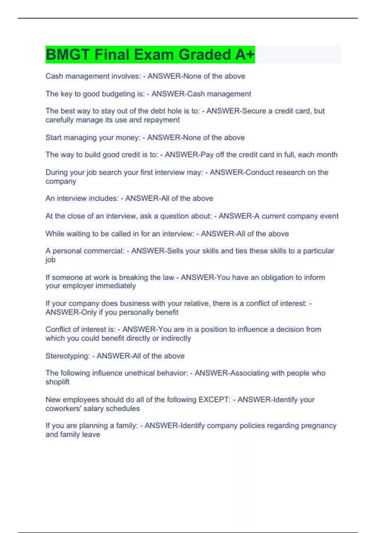 Cash management involves: - ANSWER-None of the above The key to good budgeting is: - ANSWER-Cash management The best way to stay out of the debt hole is to: - ANSWER-Secure a credit card, but carefully manage its use and repayment Start managing your money: - ANSWER-None of the above The way to build good credit is to: - ANSWER-Pay off the credit card in full, each month During your job search your first interview may: - ANSWER-Conduct research on the company An interview includes: - ANSWER-All of the above At the close of an interview, ask a question about: - ANSWER-A current company event While waiting to be called in for an interview: - ANSWER-All of the above A personal commercial: - ANSWER-Sells your skills and ties these skills to a particular job If someone at work is breaking the law - ANSWER-You have an obligation to inform your employer immediately If your company does business with your relative, there is a conflict of interest: - ANSWER-Only if you personally benefit Conflict of interest is: - ANSWER-You are in a position to influence a decision from which you could benefit directly or indirectly Stereotyping: - ANSWER-All of the above The following influence unethical behavior: - ANSWER-Associating with people who shoplift New employees should do all of the following EXCEPT: - ANSWER-Identify your coworkers' salary schedules If you are planning a family: - ANSWER-Identify company policies regarding pregnancy and family leave