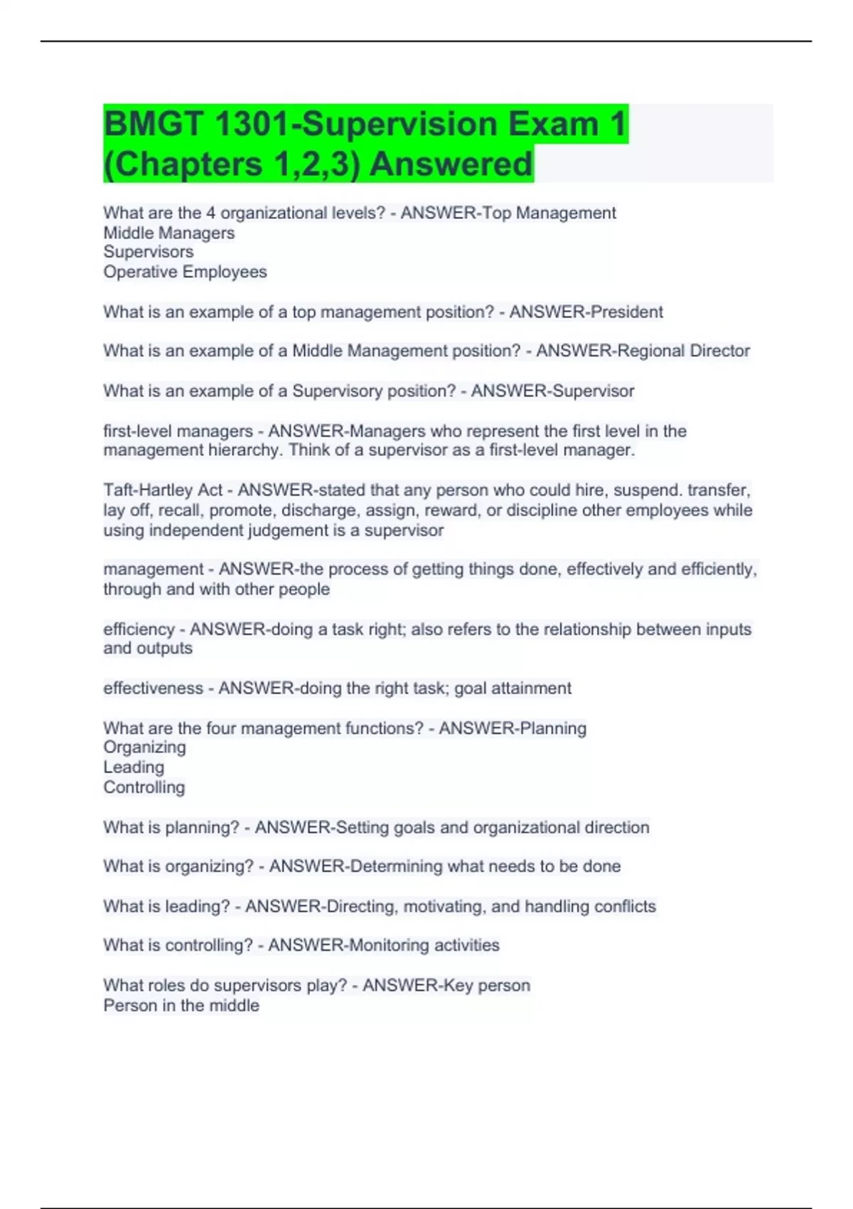 What are the 4 organizational levels? - ANSWER-Top Management Middle Managers Supervisors Operative Employees What is an example of a top management position? - ANSWER-President What is an example of a Middle Management position? - ANSWER-Regional Director What is an example of a Supervisory position? - ANSWER-Supervisor first-level managers - ANSWER-Managers who represent the first level in the management hierarchy. Think of a supervisor as a first-level manager. Taft-Hartley Act - ANSWER-stated that any person who could hire, suspend. transfer, lay off, recall, promote, discharge, assign, reward, or discipline other employees while using independent judgement is a supervisor management - ANSWER-the process of getting things done, effectively and efficiently, through and with other people efficiency - ANSWER-doing a task right; also refers to the relationship between inputs and outputs effectiveness - ANSWER-doing the right task; goal attainment What are the four management functions? - ANSWER-Planning Organizing Leading Controlling What is planning? - ANSWER-Setting goals and organizational direction What is organizing? - ANSWER-Determining what needs to be done What is leading? - ANSWER-Directing, motivating, and handling conflicts What is controlling? - ANSWER-Monitoring activities What roles do supervisors play? - ANSWER-Key person Person in the middle