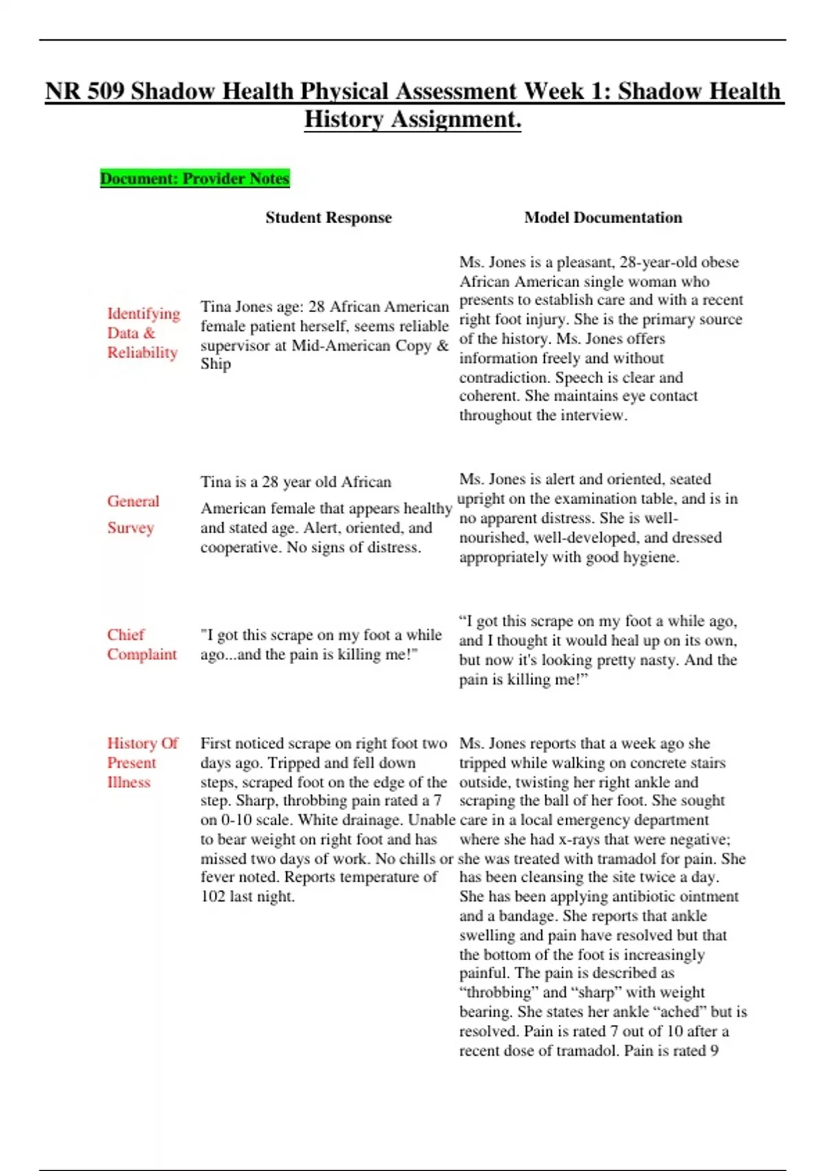 NR 509 Week 1 Shadow Health Physical Assessment: Shadow Health History Assignment.