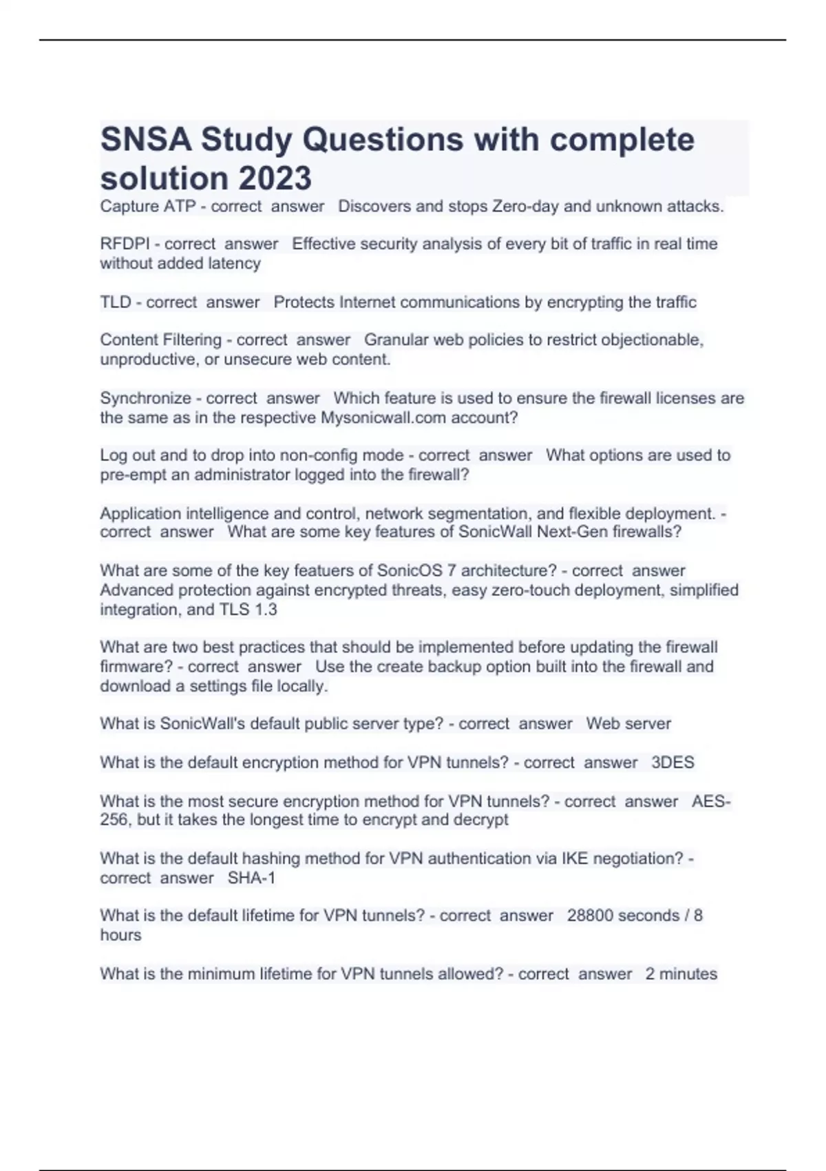 SNSA Study Questions with complete solution 2023 Capture ATP - correct answer Discovers and stops Zero-day and unknown attacks. RFDPI - correct answer Effective security analysis of every bit of traffic in real time without added latency TLD - correct answer Protects Internet communications by encrypting the traffic Content Filtering - correct answer Granular web policies to restrict objectionable, unproductive, or unsecure