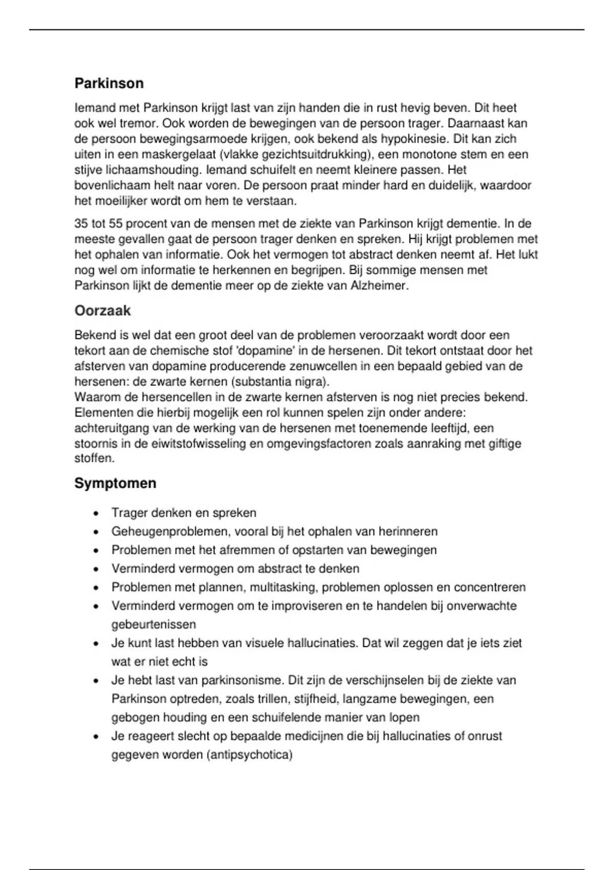 tekort aan de chemische stof 'dopamine' in de hersenen. Dit tekort ontstaat door het