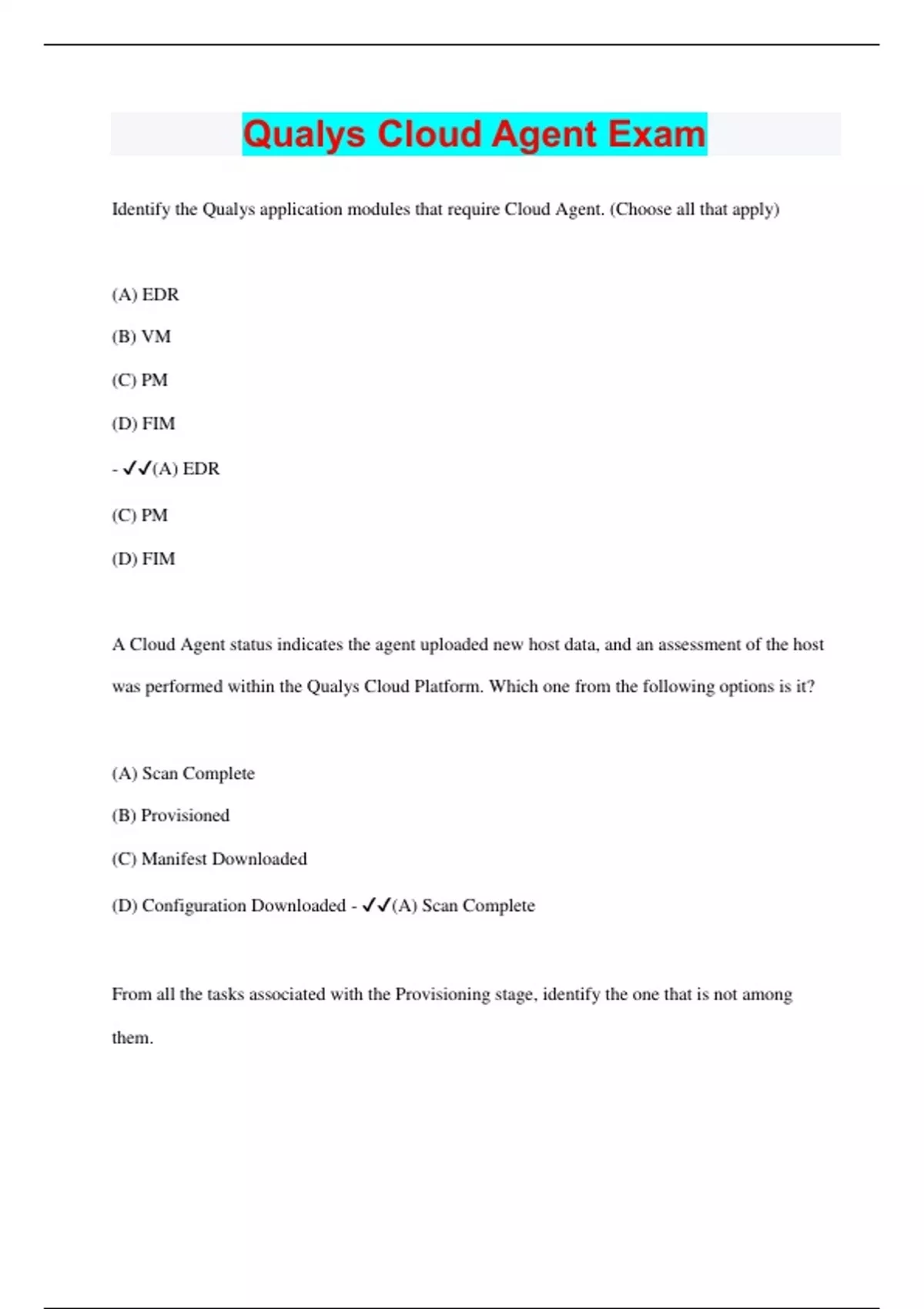Identify the Qualys application modules that require Cloud Agent. (Choose all that apply) (A) EDR (B) VM (C) PM (D) FIM - (A) EDR (C) PM (D) FIM A Cloud Agent status indicates the agent uploaded new host data, and an assessment of the host was performed within the Qualys Cloud Platform. Which one from the following options is it? (A) Scan Complete (B) Provisioned (C) Manifest Downloaded (D) Configuration Downloaded - (A) Scan Complete From all the tasks associated with the Provisioning stage, identify the one that is not among them.