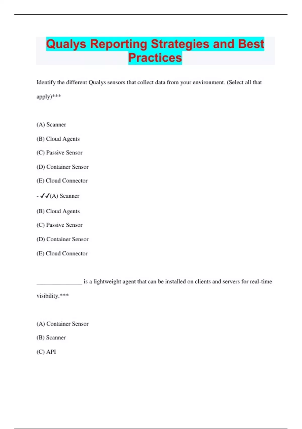 Identify the different Qualys sensors that collect data from your environment. (Select all that apply)*** (A) Scanner (B) Cloud Agents (C) Passive Sensor (D) Container Sensor (E) Cloud Connector - (A) Scanner (B) Cloud Agents (C) Passive Sensor (D) Container Sensor (E) Cloud Connector _______________ is a lightweight agent that can be installed on clients and servers for real-time visibility.*** (A) Container Sensor (B) Scanner (C) API