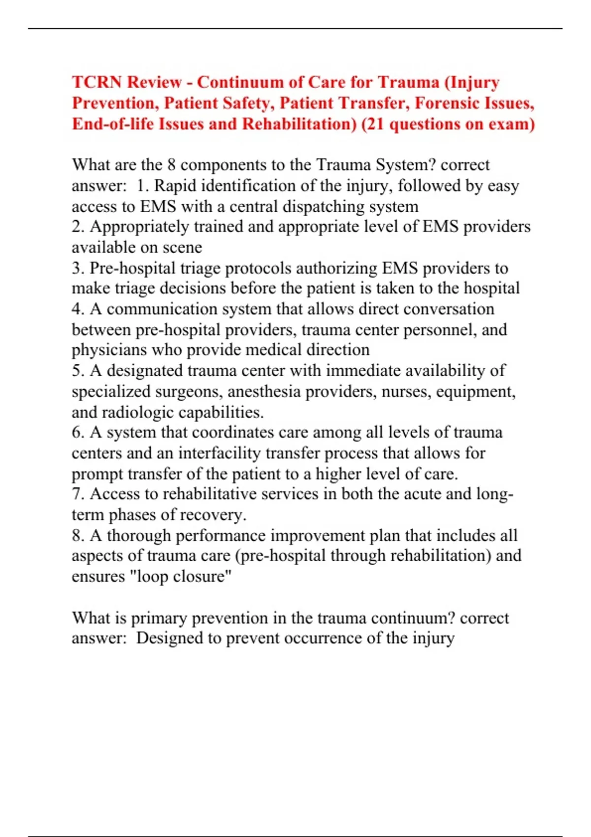 TCRN Review - Continuum of Care for Trauma (Injury Prevention, Patient Safety, Patient Transfer, Forensic Issues, End-of-life Issues and Rehabilitation) (21 questions on exam)