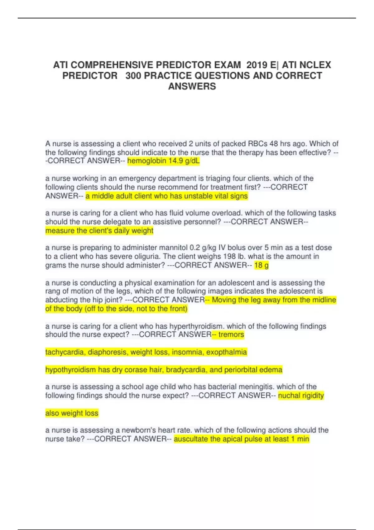 ATI COMPREHENSIVE PREDICTOR EXAM 2019 E| ATI NCLEX PREDICTOR 300 PRACTICE QUESTIONS AND CORRECT ANSWERS