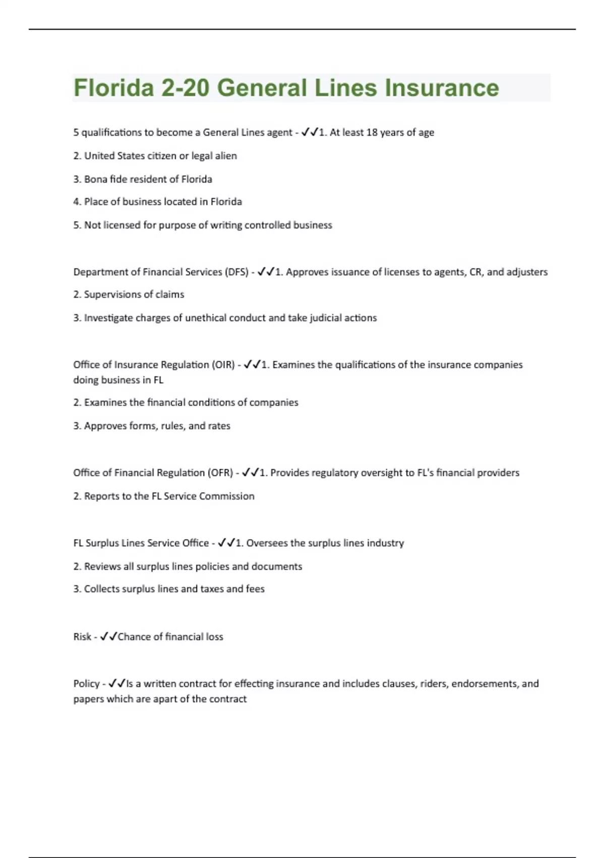 5 qualifications to become a General Lines agent - 1. At least 18 years of age 2. United States citizen or legal alien 3. Bona fide resident of Florida 4. Place of business located in Florida 5. Not licensed for purpose of writing controlled business Department of Financial Services (DFS) - 1. Approves issuance of licenses to agents, CR, and adjusters 2. Supervisions of claims 3. Investigate charges of unethical conduct and take judicial actions Office of Insurance Regulation (OIR) - 1. Examines the qualifications of the insurance companies doing business in FL 2. Examines the financial conditions of companies 3. Approves forms, rules, and rates Office of Financial Regulation (OFR) - 1. Provides regulatory oversight to FL's financial providers 2. Reports to the FL Service Commission FL Surplus Lines Service Office - 1. Oversees the surplus lines industry 2. Reviews all surplus lines policies and documents 3. Collects surplus lines and taxes and fees Risk - Chance of financial loss Policy - Is a written contract for effecting insurance and includes clauses, riders, endorsements, and papers which are apart of the contractInsurance - Is a contract where one undertakes to indemnify another or pay a specified amount determined on contingencies Binders - Temporary insurance which can be made orally or written. The insurer shall give 5 days' prior notice of cancelling a binder unless the binder is replace by a policy. No notice is required unless the binder exceeds 60 days.