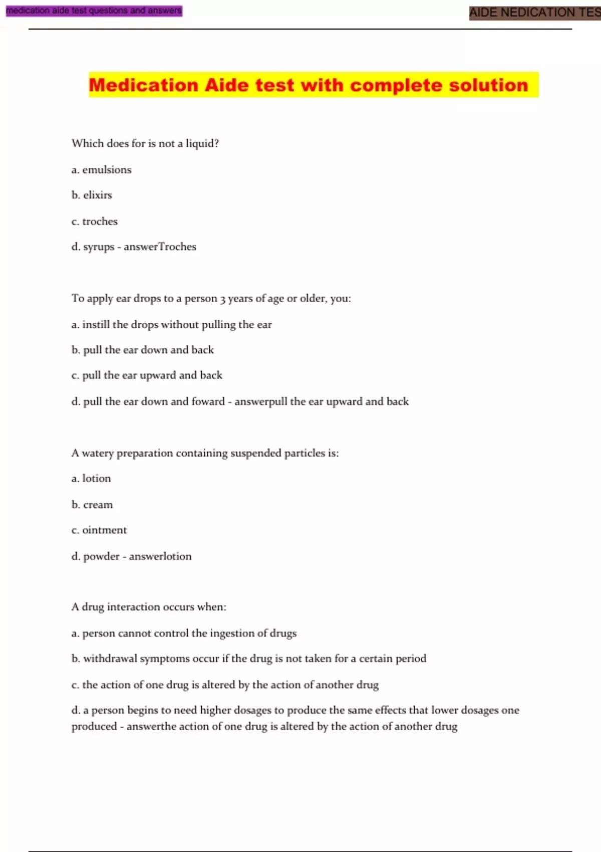 Which does for is not a liquid? a. emulsions b. elixirs c. troches d. syrups - answerTroches To apply ear drops to a person 3 years of age or older, you: a. instill the drops without pulling the ear b. pull the ear down and back c. pull the ear upward and back d. pull the ear down and foward - answerpull the ear upward and back A watery preparation containing suspended particles is: a. lotion b. cream c. ointment d. powder - answerlotion A drug interaction occurs when: a. person cannot control the ingestion of drugs b. withdrawal symptoms occur if the drug is not taken for a certain period c. the action of one drug is altered by the action of another drug d. a person begins to need higher dosages to produce the same effects that lower dosages one produced - answerthe action of one drug is altered by the action of another drug medication aide test questions and answers AIDE NEDICATION TEST You are applying a trans-dermal patch. You a. cover the patch with plastic wrap b. remove the old trans-dermal path before applying the new patch c. discard it in the trash d. tell the person the drug is absorbed quickly - answerremove the old trans-dermal path before applying the new patch Before giving a drug, you must a. take the persons pulse b. measure the blood pressure c. check the care plan d. check the allergies - answercheck the allergies Knowledge of what is right conduct and what is wrong conduct is a. criminal law b. civil law c. advanced directives d. ethics - answerethics one tsp equals a. 5mL b. 30mL c. 2mL d. 10mL - answer5mL You are applying topical nitroglycerin. You a. rub or massage the ointment into the skin b. check for an old application before applying a new one c. apply it in the per area d. apply the ointment to an irritated or open area - answercheck for an old application before applying a new one You are not sure of something on a drug order. you should a. call the pharmacist b. tell the nurse c. transcribe the order as written d. call the doctor - answertell the nurse before giving a suspension, you a. mix the drug with food b. warm the drug c. dilute the drug d. shake the bottle - answershake the bottle you suspect a person is being abused in your facility. You should a. call the police b. tell another med aide c. share your concerns with the nurse d. tell the social worker - answershare your concerns with the nurse