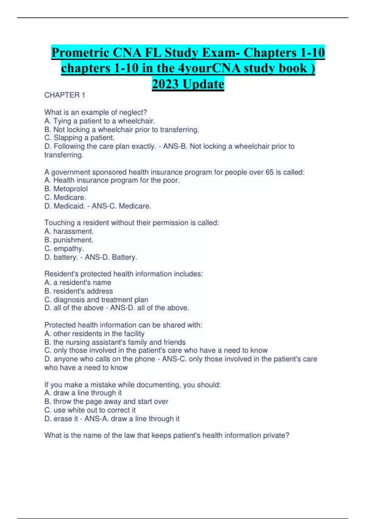 Prometric CNA FL Study Exam- Chapters 1-10 chapters 1-10 in the 4yourCNA study book ) 2023 Update CHAPTER 1 What is an example of neglect? A. Tying a patient to a wheelchair. B. Not locking a wheelchair prior to transferring. C. Slapping a patient. D. Following the care plan exactly. - ANS-B. Not locking a wheelchair prior to transferring. A government sponsored health insurance program for people over 65 is called: A. Health insurance program for the poor. B. Metoprolol C. Medicare. D. Medicaid. - ANS-C. Medicare. Touching a resident without their permission is called: A. harassment. B. punishment. C. empathy. D. battery. - ANS-D. Battery. Resident's protected health information includes: A. a resident's name B. resident's address C. diagnosis and treatment plan D. all of the above - ANS-D. all of the above. Protected health information can be shared with: A. other residents in the facility B. the nursing assistant's family and friends C. only those involved in the patient's care who have a need to know D. anyone who calls on the phone - ANS-C. only those involved in the patient's care who have a need to know If you make a mistake while documenting, you should: A. draw a line through it B. throw the page away and start over C. use white out to correct it D. erase it - ANS-A. draw a line through it What is the name of the law that keeps patient's health information private? A. OBRA B. HIPAA C. OSHA D. NAFTA - ANS-B. HIPAA A person assigned by law to be a legal advocate for a patient is called: A. ombudsman B. occupational therapist C. nurse D. CNA - ANS-A. ombudsman Which of the following is not in a CNA's scope of practice? A. bathing a patient B. inserting a catheter C. observing an IV site for redness D. documenting vital signs - ANS-B. inserting a catheter What does the term "chronic" mean? A. a condition expected to last a long time B. a condition that happened suddenly C. a type of restraint D. a hospital for psychiatric patients - ANS-A. a condition expected to last a long time Define: Domestic Violence - ANS-D. Abuse by spouses, intimate partners or family members. Define: Hospice Care - ANS-G. Care provided for people with a terminal illness. Define: Acute Care - ANS-C. Medically necessary care performed in a hospital. Define: Long Term Care - ANS-F. Continuous care for chronic illnesses. Define: Scope Of Practice - ANS-I. Defines what you are allowed to do and how to do it safely. Define: Liability - ANS-J. A legal term regarding responsibility for harm Define: Resident's Rights - ANS-B. Specifies how residents must be treated when living in a long-term care facility Define: Neglect - ANS-H. Failure to provide necessary care for a patient Define: Ombusman - ANS-E. A legal advocate for the resident assigned by law Define: HIPAA - ANS-A. A law designed to keep health information private CHAPTER 2 - ANSWhich of the following would you NOT report immediately to your nurse? A. chest pain B. loss of consciousness C. normal vital signs D. high fever - ANS-C. Normal vital signs When should unsafe conditions be reported? A. After an accident has occurred B. before an accident can occur C. when you find time D. when someone complains - ANS-B. Before an accident occurs Standard Precautions are rules for: A. Infection control B. accident prevention C. communication D. recognizing abuse - ANS-A. Infection control Bloodborne diseases are transmitted by: A. hugs and cuddling B. sweat C. blood and body fluids D. talking, laughing or singing - ANS-C. blood and body fluids During seizures, you should: A. time the seizure B. protect the patient C. notify the nurse D. all of the above - ANS-D. all of the above When controlling, you should: A. apply direct pressure with clean gauze B. apply a band- aid immediately C. call 911 D. restrain the patient - ANS-A. apply direct pressure with clean gauze In the event of a fire, what is your FIRST action? A. Extinguish the fire B. call for help C. remove the residents from the area D. portal of entry - ANS-C. remove the residents from the area The single most important thing a CNA can do to prevent the spread of disease is: A. forbidding visitors B. handwashing C. antibiotic therapy D: sterilizing sheets - ANS-B. Handwashing MRSA is: A. a staph infection resistant to powerful antibiotics B. a very minor disease C. a problem in Europe D. a form of cancer - ANS-A. a staph infection resistant to powerful antibiotics Define: Objective information - ANS-G. Observations based on what you see, hear, touch or smell Define: Disorientation - ANS-D. Confusion about person, place or time Define: Incontinence - ANS-I. The inability to control the bladder or bowels Define: Culture - ANS-A. A system of behaviors people learn from the people they live with Define: Insulin Reaction - ANS-B. Results from too much insulin or too little food (hypoglemcemia) Define: CVA - ANS-J. Cerebrovascular accident - the medical term for a stroke Define: Seizures - ANS-C. Involuntary, often violent, contractions of the muscles Define: Gloves - ANS-F. A type of personal protective equipment (PPE) worn on the hands Define: Airbrone Precautions - ANS-E. Used for diseases that can be transmitted through the air Define: Hepatitis - ANS-H. An inflammation of the liver caused by viral infection CHAPTER 3 - ANSA loss of independence can cause: A. depression B. isolation or anger C. poor self-image D. all of the above - ANS-D. all of the above Which of the following is a psychosocial need? Continues...