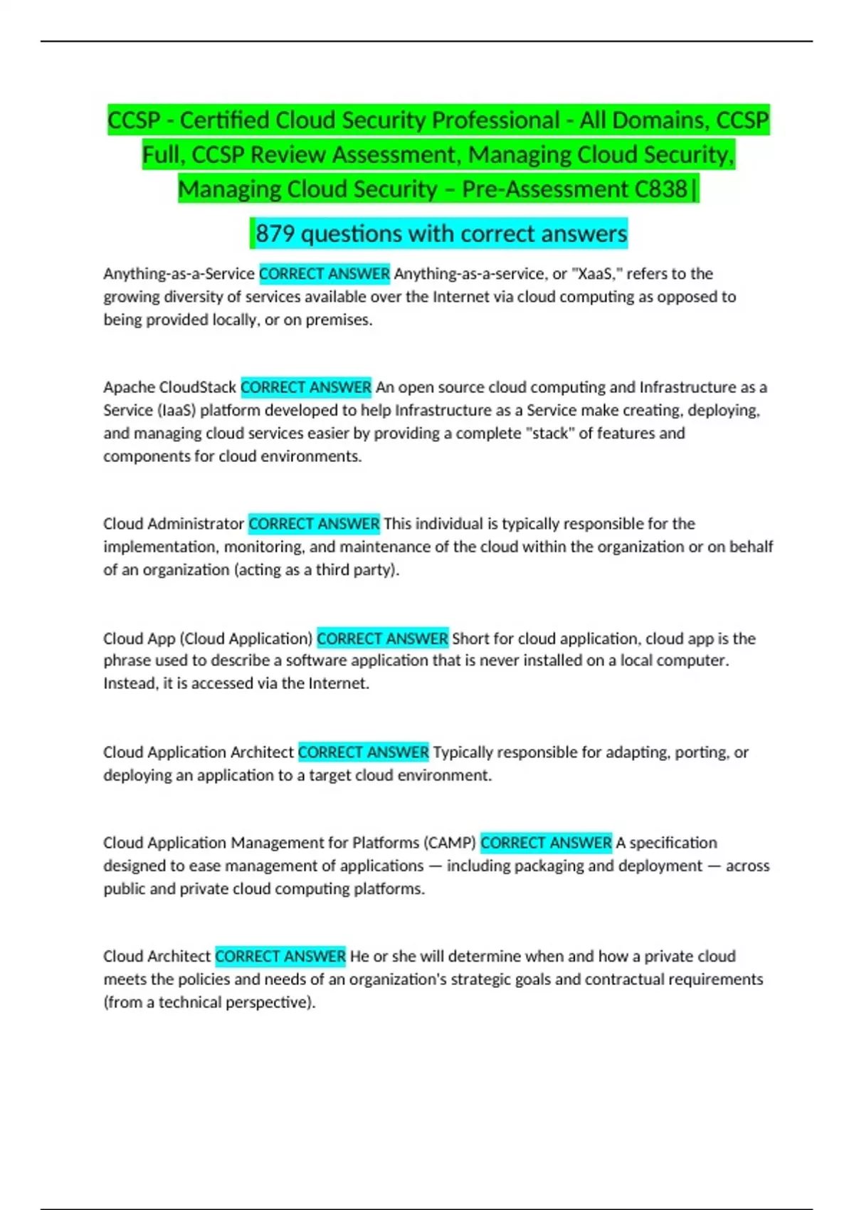 CCSP - Certified Cloud Security Professional - All Domains, CCSP Full, CCSP Review Assessment, Managing Cloud Security, Managing Cloud Security – Pre-Assessment C838| 879 questions with correct answers