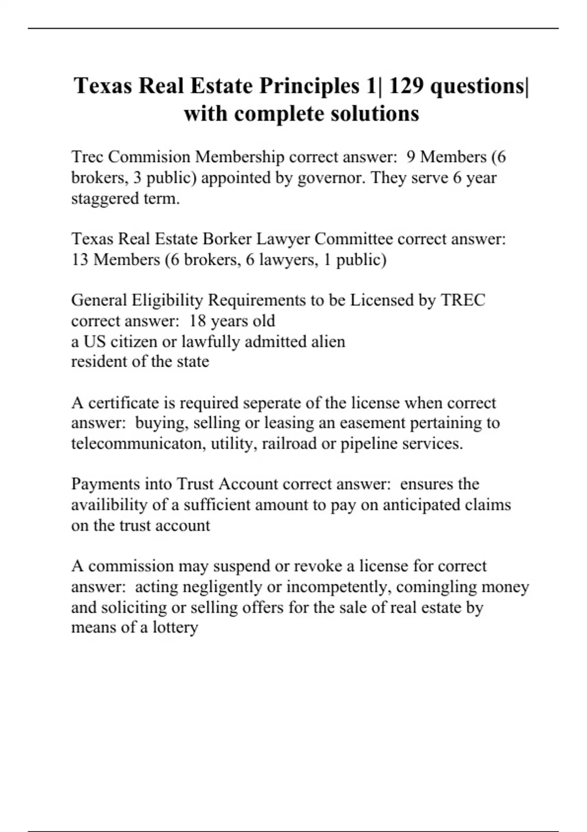Texas Real Estate Principles 1| 129 questions| with complete solutions
