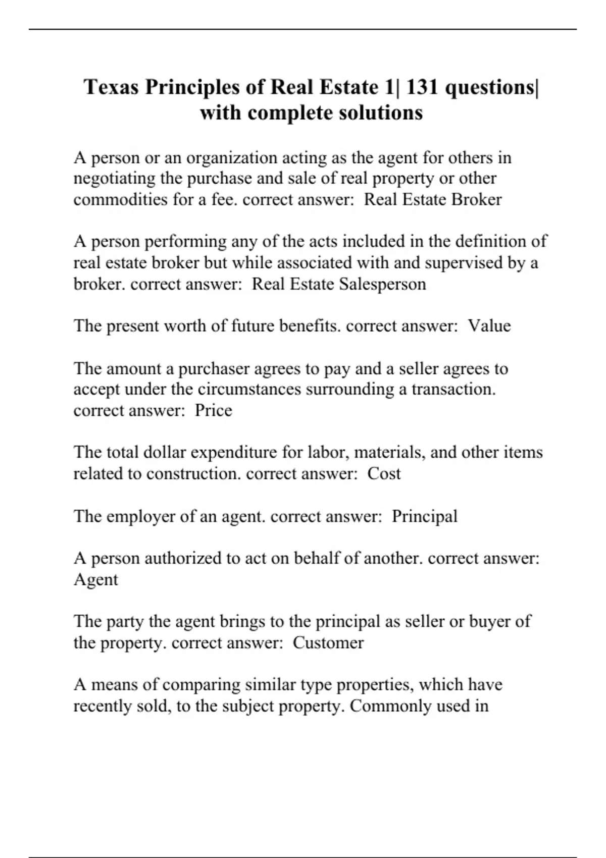 Texas Principles of Real Estate 1| 131 questions| with complete solutions