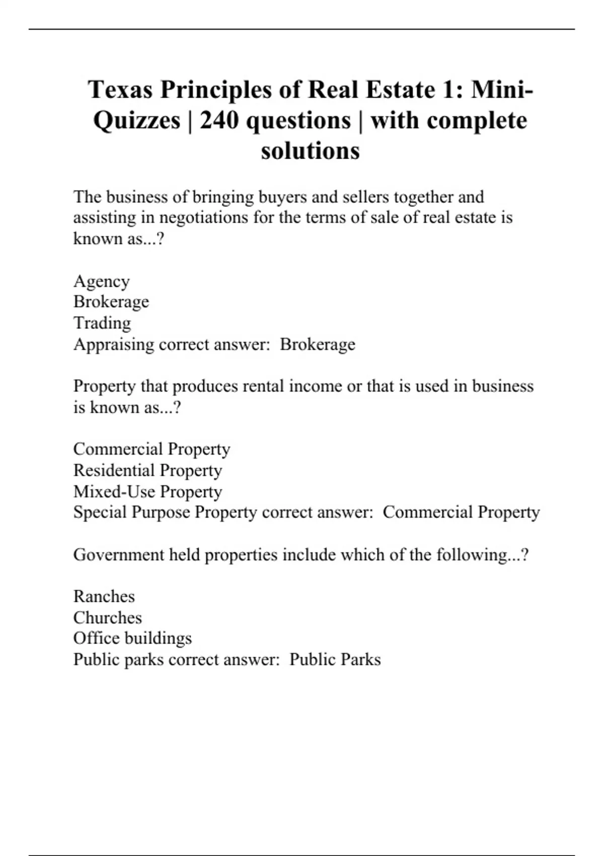 Texas Principles of Real Estate 1: Mini-Quizzes | 240 questions | with complete solutions