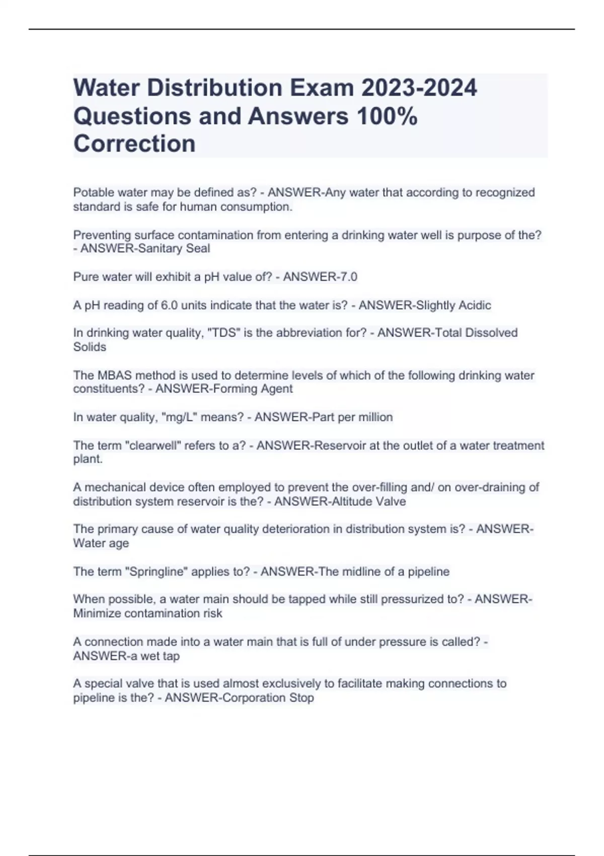 Water Distribution Exam Questions and Answers 100% CorrectionWater Distribution Exam Questions and Answers 100% CorrectionWater Distribution Exam Questions and Answers 100% CorrectionWater Distribution Exam Questions and Answers 100% CorrectionPotable water may be defined as? - ANSWER-Any water that according to recognized standard is safe for human consumption. Preventing surface contamination from entering a drinking water well is purpose of the? - ANSWER-Sanitary Seal Pure water will exhibit a pH value of? - ANSWER-7.0 A pH reading of 6.0 units indicate that the water is? - ANSWER-Slightly Acidic In drinking water quality, "TDS" is the abbreviation for? - ANSWER-Total Dissolved Solids The MBAS method is used to determine levels of which of the following drinking water constituents? - ANSWER-Forming Agent In water quality, "mg/L" means? - ANSWER-Part per million The term "clearwell" refers to a? - ANSWER-Reservoir at the outlet of a water treatment plant.
