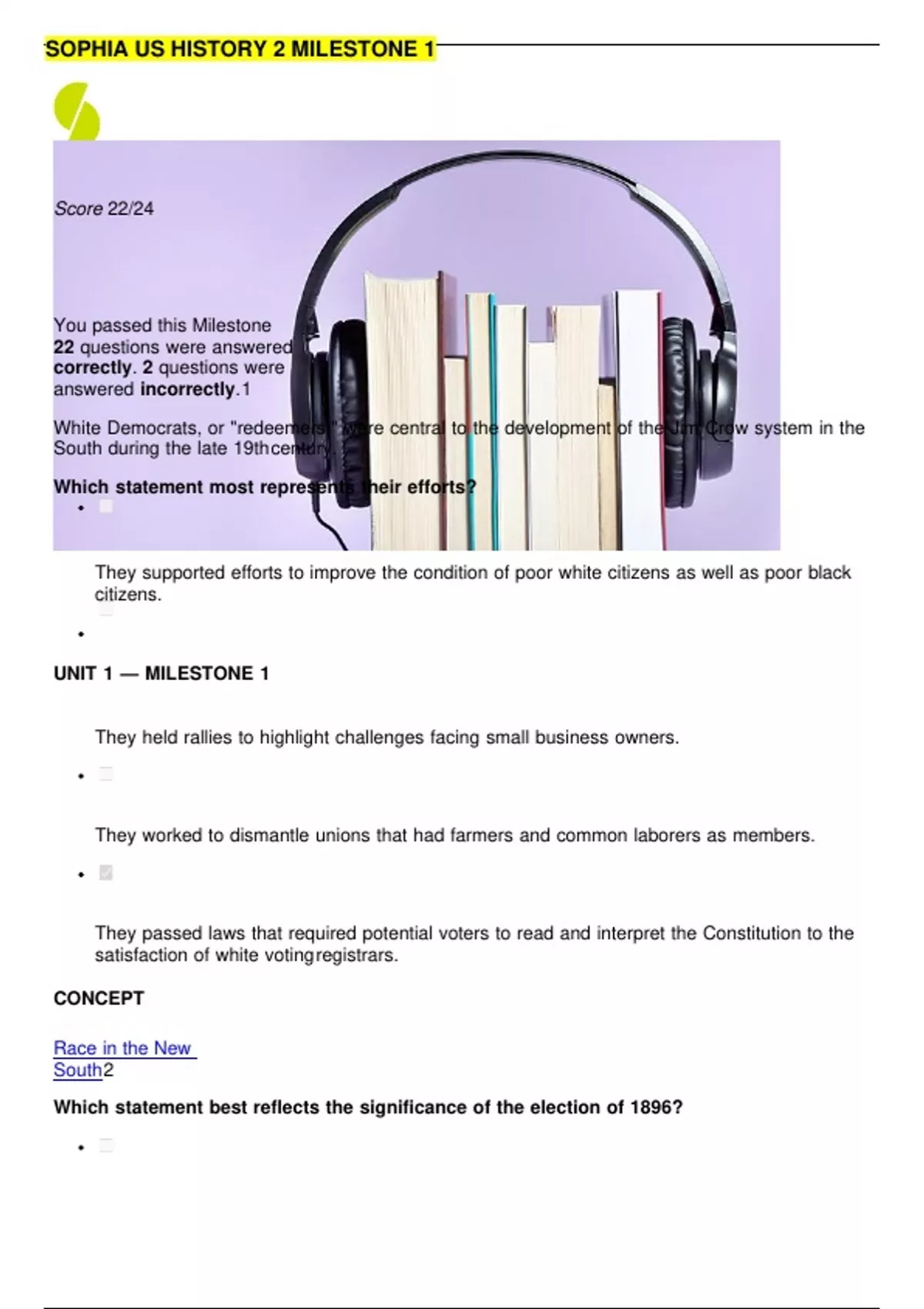 SOPHIA US HISTORY 2 MILESTONE 1 Score 22/24 You passed this Milestone 22 questions were answered correctly. 2 questions were answered incorrectly. 1 White Democrats, or "redeemers," were central to the development of the Jim Crow system in the South during the late 19th century. Which statement most represents their efforts? They supported efforts to improve the condition of poor white citizens as well as poor black citizens. UNIT 1 — MILESTONE 1 They held rallies to highlight challenges facing small business owners. They worked to dismantle unions that had farmers and common laborers as members. They passed laws that required potential voters to read and interpret the Constitution to the satisfaction of white voting registrars. CONCEPT Race in the New South 2 Which statement best reflects the significance of the election of 1896?Ties between the Republican Party and big businesses weakened due to populist pressure. The Populist Party ceased to exist as an independent political entity following the election. Bryan won the popular vote, but McKinley won the electoral college by a slim margin. The election led to the resumption of minting silver. CONCEPT The Election of 1896 3 Which statement about populism most closely aligns with historian Michael Kazin’s interpretation of the term? It is a political style that uses a certain type of language and rhetoric to advance the agenda of a political coalition. It offers a democratic alternative to compulsory government that is harmful or corrupted. It represents a distinct political movement that offers a democratic alternative to the corporate state. It is a political stance that supports every individual’s right to maximum liberty and freedom. CONCEPT How Historians View Populism 4 Because of the economic downturn in the 1890s, many Americans organized in order to seek relief from corporations and elected officials. Choose the statement that reflects an action undertaken in the 1890s to improve conditions forworkers. "American farmers and urban workers united in powerful unions to sway national policy." "We hired Pinkerton private security officers to protect laborers at our company." "We joined with farmers in a national political coalition to gain a more powerful voice in the federal government.” “We marched on Washington, D.C. to advocate for public works jobs for the unemployed.” CONCEPT Economic Depression and Labor Unrest in the 1890s 5 Suppose two competing railroad companies agreed to fix shipping rates at a level that benefited both. What is this kind of voluntary arrangement called? A pool A holding company A trust A monopoly CONCEPT Corporations and Industry in the Late 19th Century 6 Which of the following men was associated with the growth of the Populist Party in the late 19thcentury? Garret Hobart David Bennett Hill William McKinley Ignatius Donnelly CONCEPT Rural America in the Late 19th Century 7 In the summer of 1893, a young historian, Frederick Jackson Turner, presented a paper that explained his views on the significance of the frontier in American history. Choose the statement that best reflects Turner’s views on the significance of the Western frontier. Turner apologized for the subjugation of Native Americans. Turner included women in his argument, rejecting the myth that the West was only for rugged, masculine individuals. Turner proposed that American society in the West was fundamentally different from the Eastern United States. Turner argued that Western expansion allowed those who were dissatisfied with their economic or social positions elsewhere to improve them on the frontier. CONCEPTThe Frontier in American History 8 Choose the factor that was most likely an effect of rapid industrialization in the United States during the late 19th century. Increased reliance on local shops and markets Rapid growth of the interstate highway system Local safety regulations on tenement housing Improvements in communication such as the telephone CONCEPT Growth of the City 9 Choose the true statement about the nature of the rural economy in the late 19th century. Strong farmers unions won court cases to regulate interstate commerce to farmers' benefit. Lenders and farmers used the crop-lien system to subsidize the cost of running a farm. Industrialization led to the development of steel plows and other tools that increased both the supply of wheat and its market price. Many Southern landowners sold their lands to poor white and black farmers at reduced prices so they could establish their own livelihoods. CONCEPTRural America in the Late 19th Century 10 "The telegraph profoundly changed businesses and governments by making rapid, long-distance communication possible." A historian would most likely make this statement if they were analyzing this image through what historical lens? Law Class Gender ScienceCONCEPT The Lenses of History 11 Kino, an experienced historian, is very interested in the internment of Japanese Americans during World War II. As a historian, he is aware of possible influences on his interpretation of events. Which factor should be allowed to influence his interpretation? His personal bias toward Japanese Americans The lenses he wants to apply The language he uses The sensitivities of others CONCEPT The Historian's Practice 12 In the late 19th century, the consolidation of manufacturing in large cities and an ever-growing railroad system changed the nature of consumption in rural America. Choose the statement that best describes one of these changes in the nature of rural consumption. Mary bought a new piano from Sears, but it had become more expensive than if she had bought it locally. Sarah wanted to purchase a new sewing machine, but no longer could because she did not have enough cash on hand. John’s small general store now had plenty of customers, and he was able to do excellentbusiness. Ed’s newspaper began to include full-page advertisements for new consumer products.