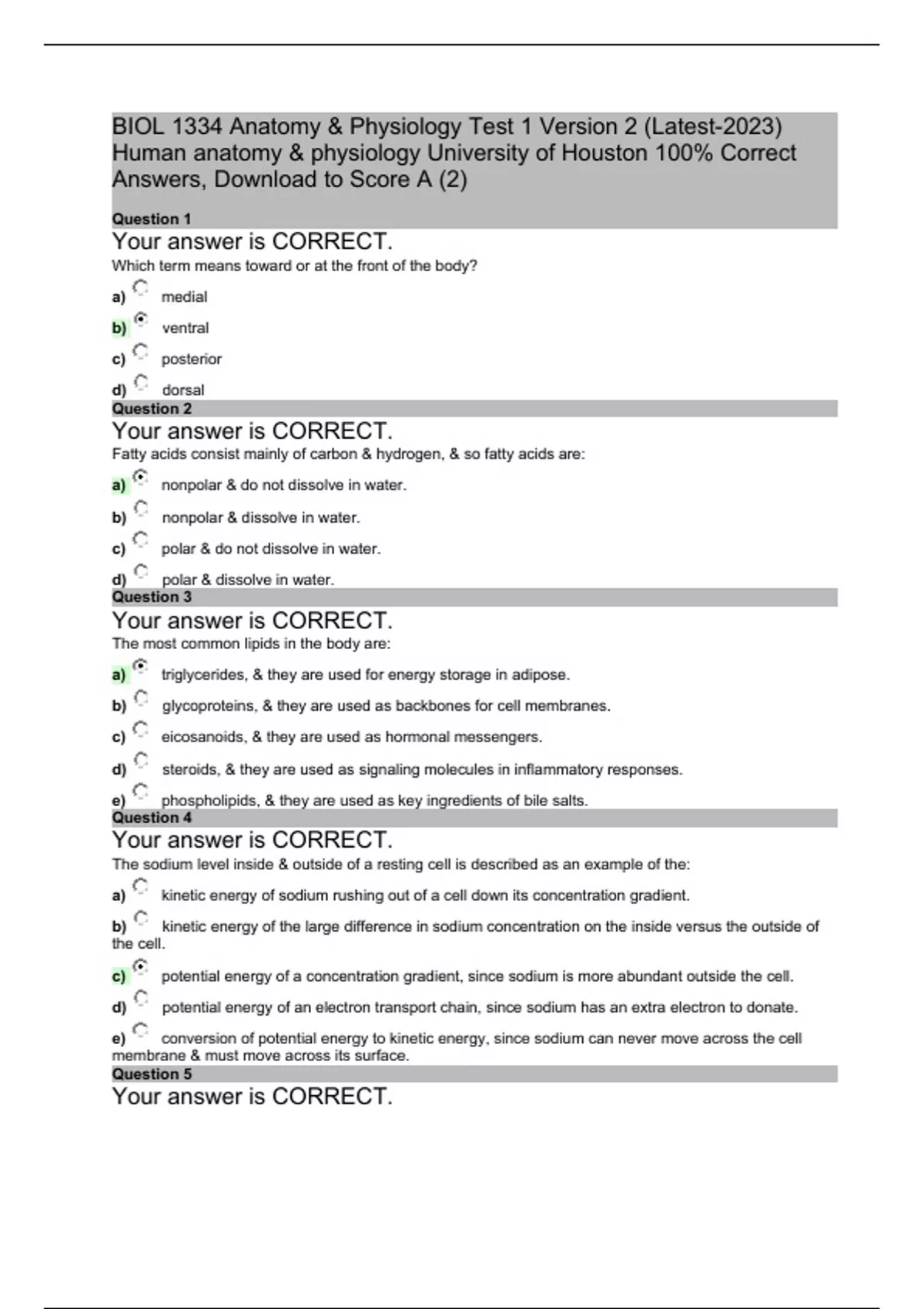 BIOL 1334 Anatomy & Physiology Test 1 Version 2 (Latest-2023) Human anatomy and physiology University of Houston 100% Correct Answers, Download to Score A (2)