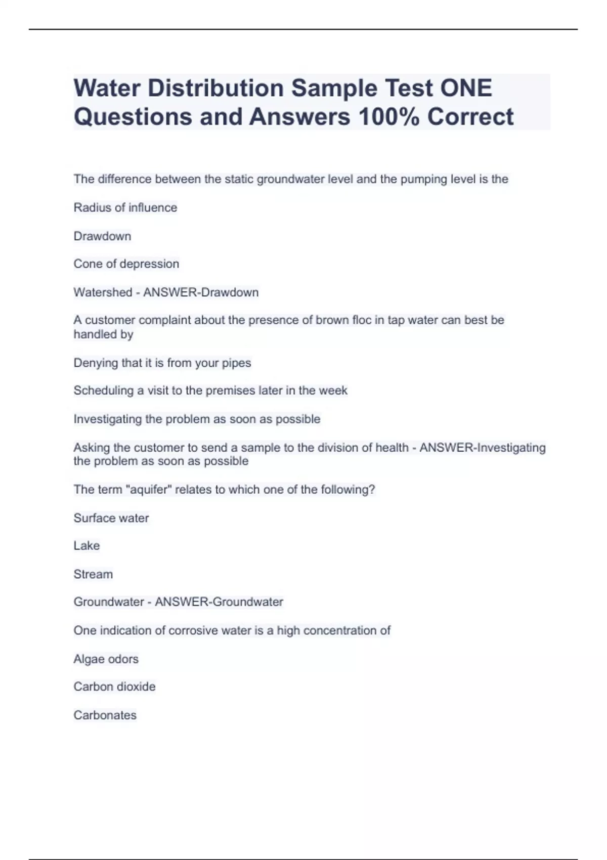 Water Distribution Sample Test ONE Questions and Answers 100% CorrectWater Distribution Sample Test ONE Questions and Answers 100% CorrectWater Distribution Sample Test ONE Questions and Answers 100% CorrectWater Distribution Sample Test ONE Questions and Answers 100% CorrectWater Distribution Sample Test ONE Questions and Answers 100% Correct The difference between the static groundwater level and the pumping level is the Radius of influence Drawdown Cone of depression Watershed - ANSWER-Drawdown A customer complaint about the presence of brown floc in tap water can best be handled by Denying that it is from your pipes Scheduling a visit to the premises later in the week Investigating the problem as soon as possible Asking the customer to send a sample to the division of health - ANSWER-Investigating the problem as soon as possible The term "aquifer" relates to which one of the following? Surface water Lake Stream Groundwater - ANSWER-Groundwater One indication of corrosive water is a high concentration of
