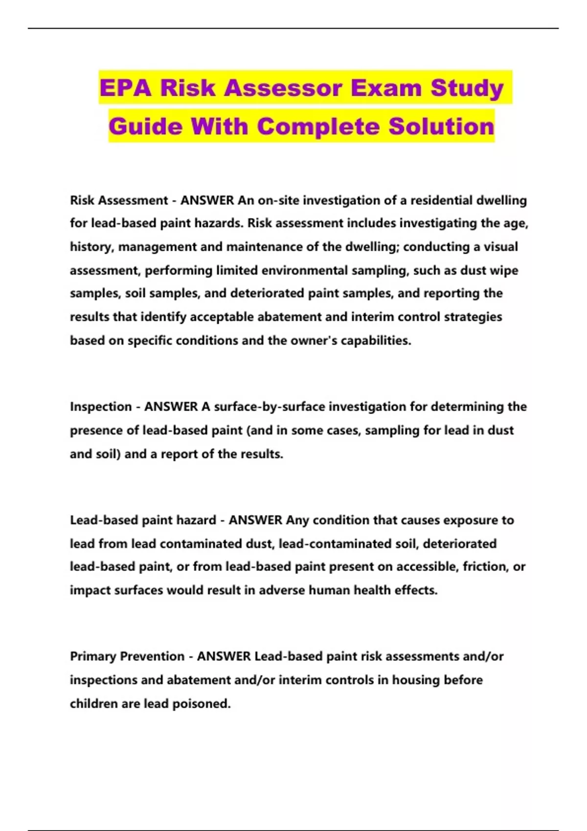EPA Risk Assessor Exam Study Guide With Complete Solution...
