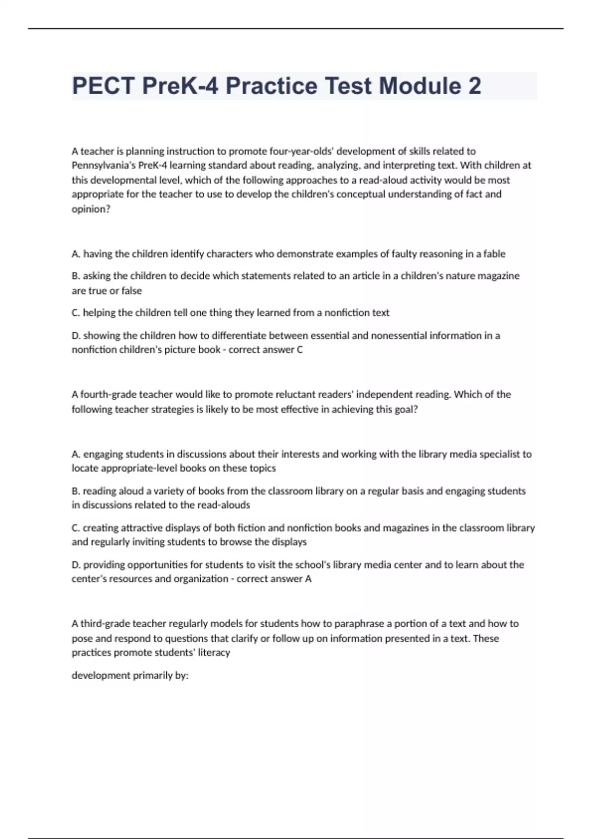 PECT PreK-4 Practice Test Module 2 fully solved 2023
