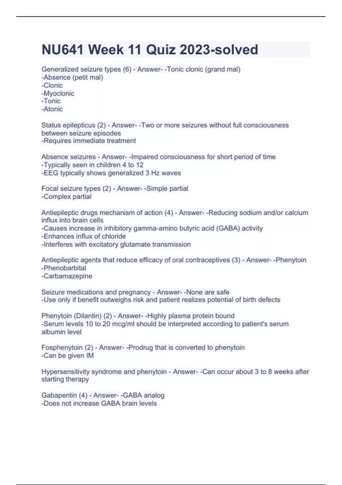 NU641 Week 11 Quiz with correct answers Generalized seizure types (6) correct answer -Tonic clonic (grand mal) -Absence (petit mal) -Clonic -Myoclonic -Tonic -Atonic Status epilepticus (2) correct answer -Two or more seizures without full consciousness between seizure episodes -Requires immediate treatment Absence seizures correct answer -Impaired consciousness for short period of time -Typically seen in children 4 to 12 -EEG typically shows generalized 3 Hz waves Focal seizure types (2) correct answer -Simple partial -Complex partial Antiepileptic drugs mechanism of action (4) correct answer -Reducing sodium and/or calcium influx into brain cells -Causes increase in inhibitory gamma-amino butyric acid (GABA) activity -Enhances influx of chloride -Interferes with excitatory glutamate transmission Antiepileptic agents that reduce efficacy of oral contraceptives